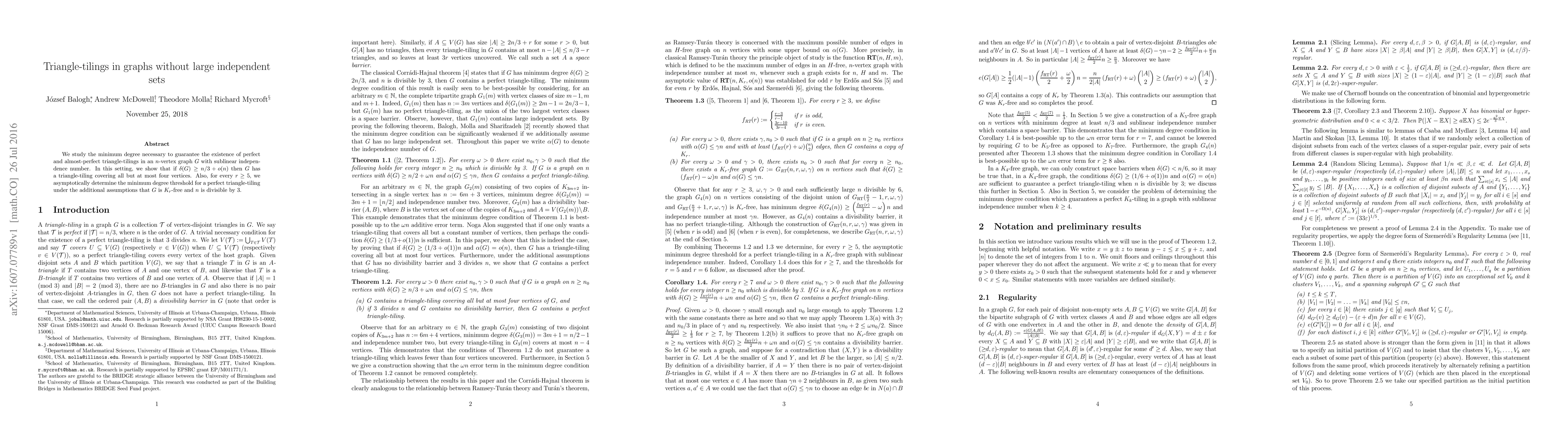 We study the minimum degree necessary to guarantee the existence of perfect and almost-perfect triangle-tilings in an $n$-vertex graph $G$ with sublinear independence number. In this setting, we show that if $\delta(G) \ge n/3 + o(n)$ then $G$ has a triangle-tiling covering all but at most four vertices. Also, for every $r \ge 5$, we asymptotically determine the minimum degree threshold for a perfect triangle-tiling under the additional assumptions that $G$ is $K_r$-free and $n$ is divisible by $3$.