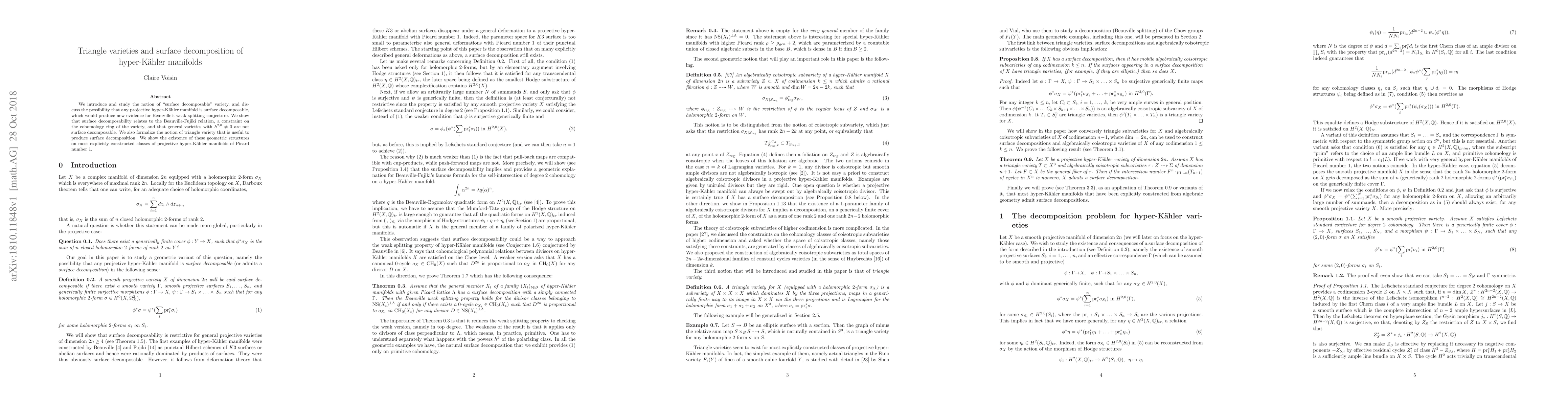 This paper introduces "surface decomposable" varieties and explores their relation to projective hyper-Kähler manifolds, potentially supporting Beauville's weak splitting conjecture. It also formalizes triangle varieties to facilitate surface decomposition, demonstrating their presence in most projective hyper-Kähler manifolds with Picard number 1.