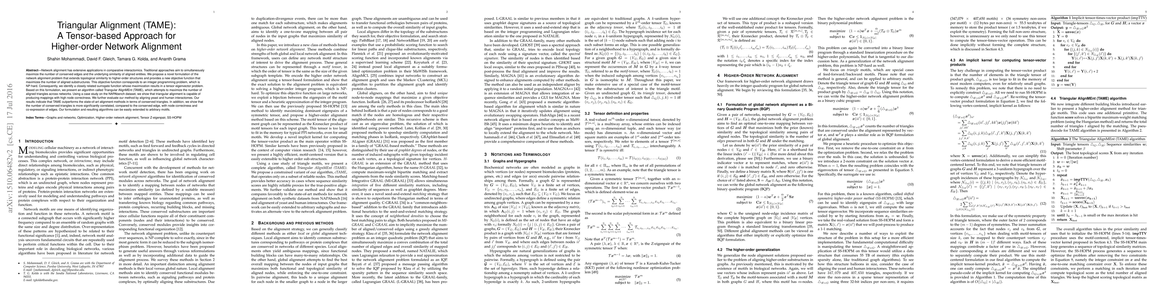 A new method called Triangular AlignMEnt (TAME) uses tensor analysis to align networks by maximizing aligned triangles, outperforming existing methods in terms of conserved triangles and node correctness.
