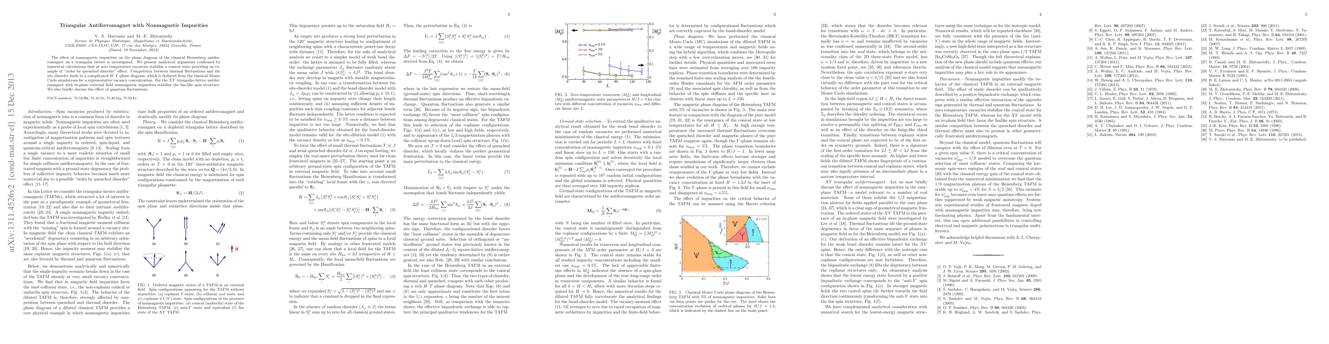 The effect of nonmagnetic impurities on the phase diagram of the classical Heisenberg antiferromagnet on a triangular lattice is investigated. We present analytical arguments confirmed by numerical calculations that at zero temperature vacancies stabilize a conical state providing an example of "order by quenched disorder" effect. Competition between thermal fluctuations and the site disorder leads to a complicated H-T phase diagram, which is deduced from the classical Monte Carlo simulations for a representative vacancy concentration. For the XY triangular-lattice antiferromagnet with in-plane external field nonmagnetic impurities stabilize the fan-like spin structure. We also briefly discuss the effect of quantum fluctuations.