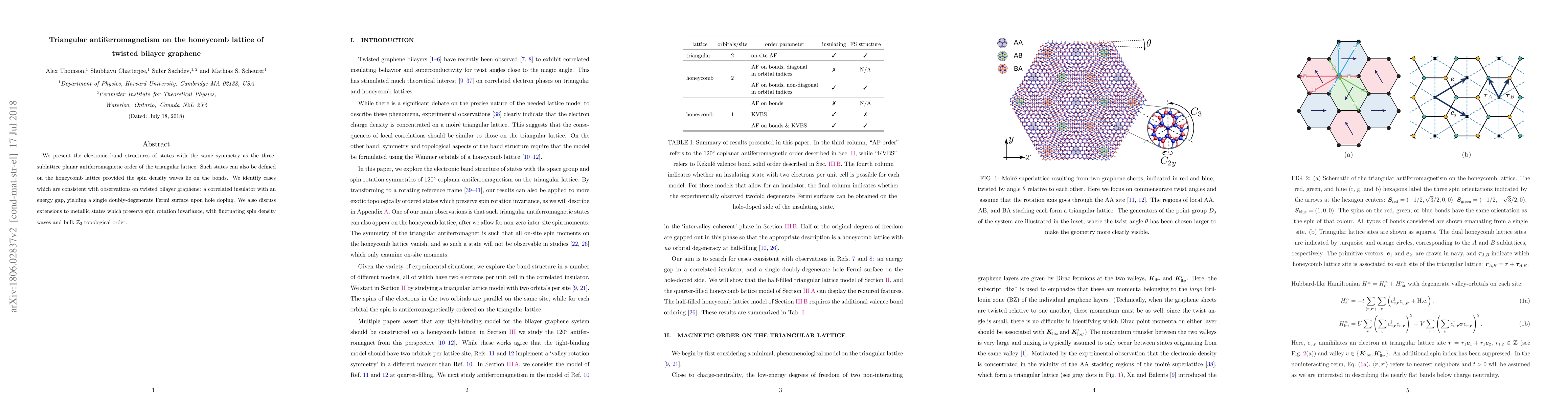 We present the electronic band structures of states with the same symmetry as the three-sublattice planar antiferromagnetic order of the triangular lattice. Such states can also be defined on the honeycomb lattice provided the spin density waves lie on the bonds. We identify cases which are consistent with observations on twisted bilayer graphene: a correlated insulator with an energy gap, yielding a single doubly-degenerate Fermi surface upon hole doping. We also discuss extensions to metallic states which preserve spin rotation invariance, with fluctuating spin density waves and bulk $\mathbb{Z}_2$ topological order.