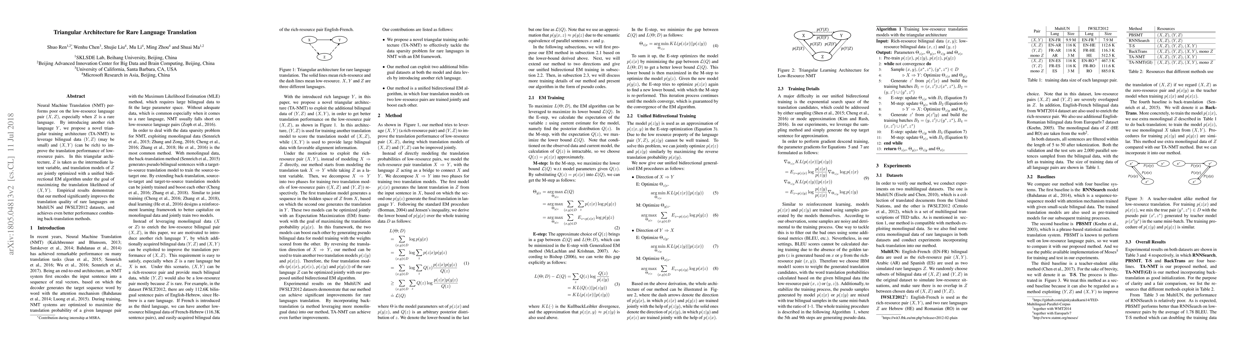 Neural Machine Translation (NMT) performs poor on the low-resource language pair $(X,Z)$, especially when $Z$ is a rare language. By introducing another rich language $Y$, we propose a novel triangular training architecture (TA-NMT) to leverage bilingual data $(Y,Z)$ (may be small) and $(X,Y)$ (can be rich) to improve the translation performance of low-resource pairs. In this triangular architecture, $Z$ is taken as the intermediate latent variable, and translation models of $Z$ are jointly optimized with a unified bidirectional EM algorithm under the goal of maximizing the translation likelihood of $(X,Y)$. Empirical results demonstrate that our method significantly improves the translation quality of rare languages on MultiUN and IWSLT2012 datasets, and achieves even better performance combining back-translation methods.