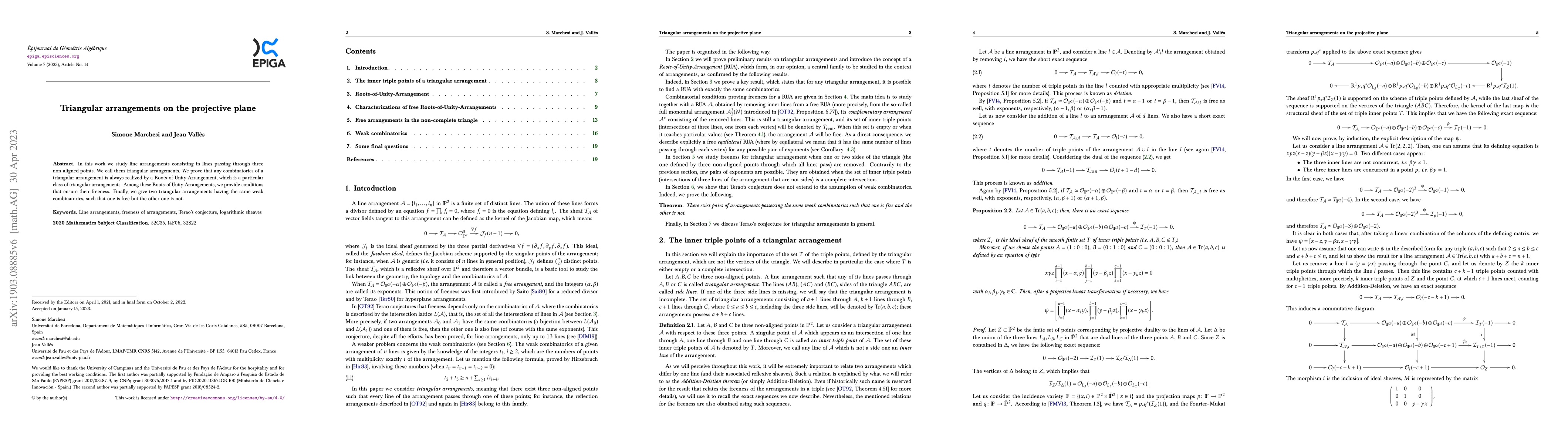 This research investigates triangular arrangements on the projective plane, demonstrating that any combinatorial structure can be realized by Roots-of-Unity-Arrangements, a specific subset of such arrangements. It also establishes conditions for ensuring the freeness of these arrangements and presents examples of two distinct arrangements with identical combinatorial properties but differing in freeness.
