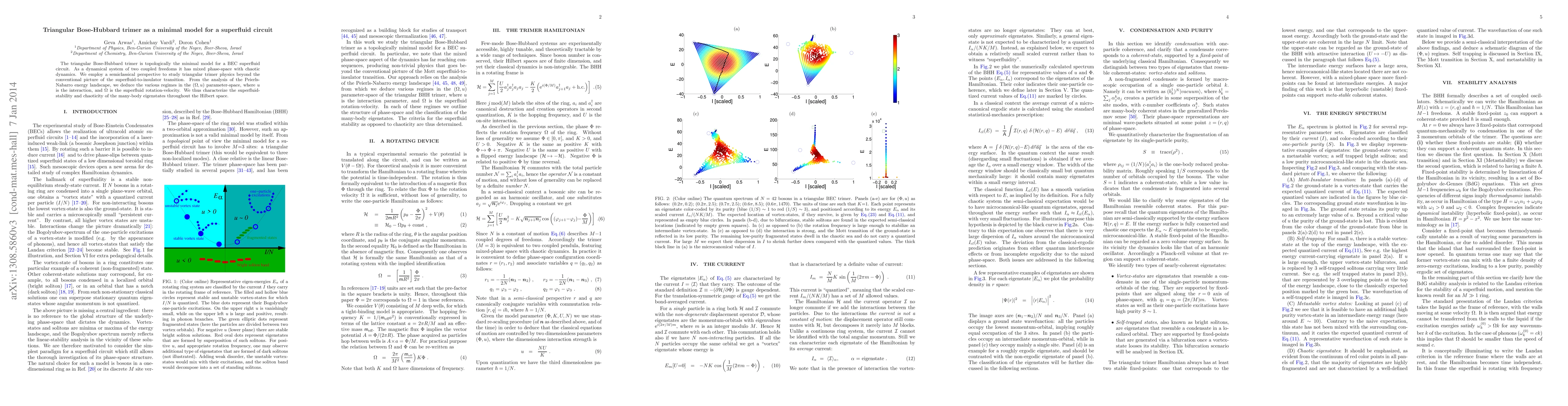 The triangular Bose-Hubbard trimer is a minimal model for a superfluid circuit, exhibiting mixed phase-space with chaotic dynamics. The researchers study its physics using a semiclassical perspective, characterizing the superfluid-stability and chaoticity of many-body eigenstates in different regimes.