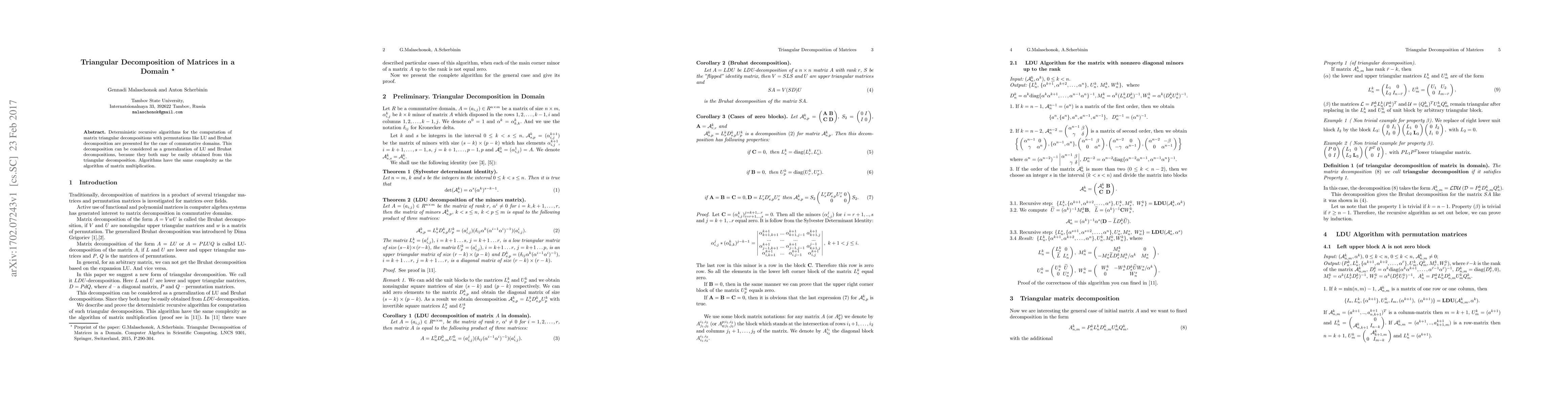 This paper introduces deterministic recursive algorithms for computing matrix triangular decompositions in commutative domains, generalizing LU and Bruhat decompositions, with computational complexity comparable to matrix multiplication.