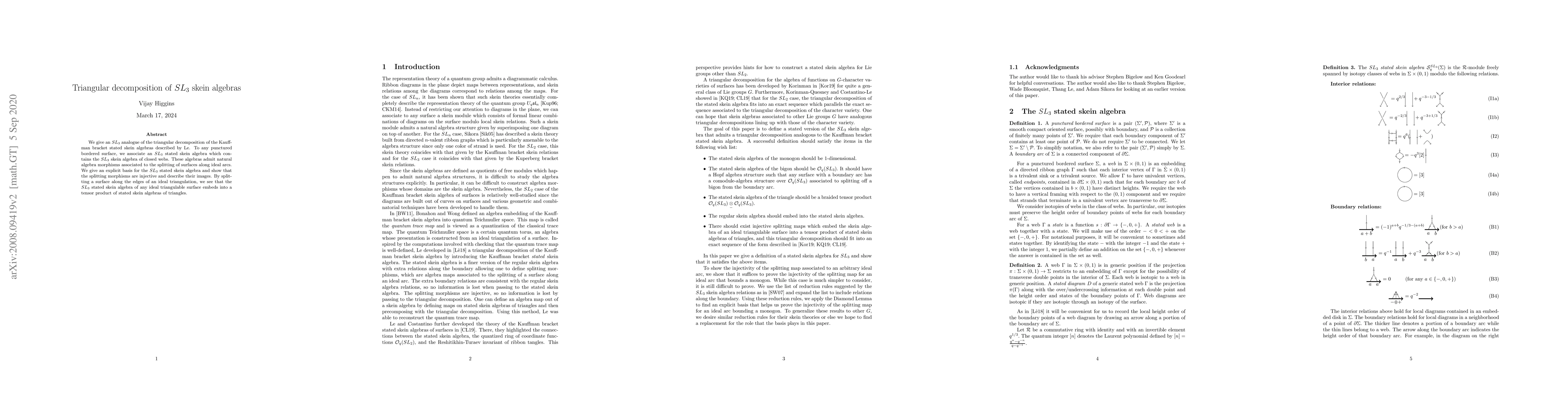 The paper provides an $SL_3$ analogue of the triangular decomposition for Kauffman bracket skein algebras, giving an explicit basis and demonstrating the injectivity of splitting morphisms. It shows that the $SL_3$ stated skein algebra of any ideal triangulable surface embeds into a tensor product of skein algebras of triangles.