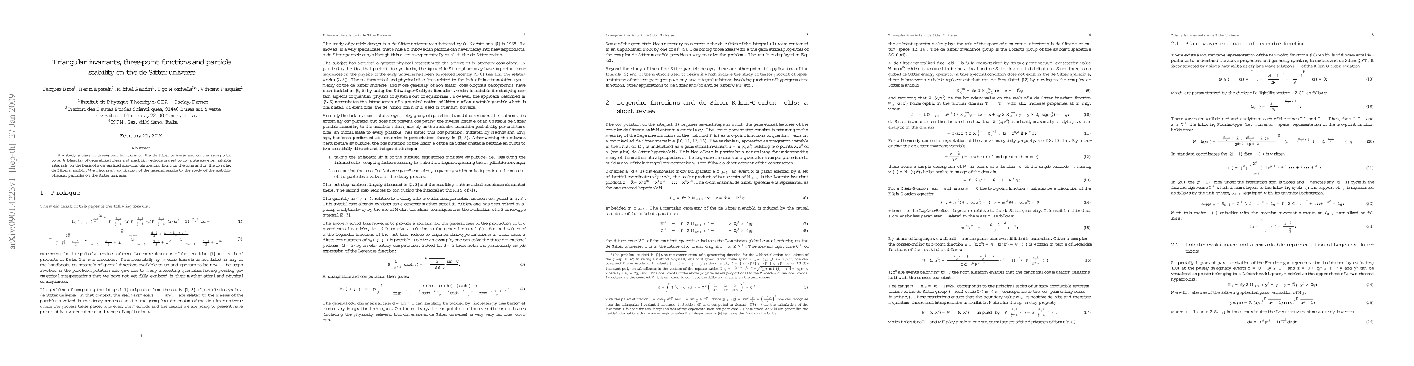 This paper explores three-point functions on the de Sitter universe and asymptotic cone to study particle stability using a blend of geometry and analytic methods, revealing remarkable integrals with potential implications for understanding particle behavior.
