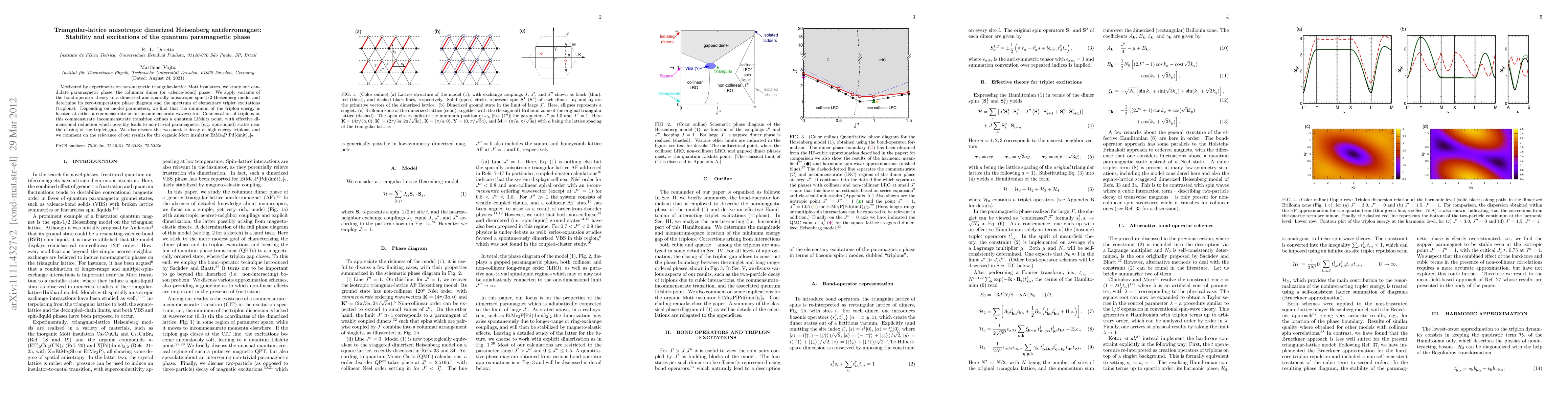 Motivated by experiments on non-magnetic triangular-lattice Mott insulators, we study one candidate paramagnetic phase, the columnar dimer (or valence-bond) phase. We apply variants of the bond-operator theory to a dimerized and spatially anisotropic spin-1/2 Heisenberg model and determine its zero-temperature phase diagram and the spectrum of elementary triplet excitations (triplons). Depending on model parameters, we find that the minimum of the triplon energy is located at either a commensurate or an incommensurate wavevector. Condensation of triplons at this commensurate-incommensurate transition defines a quantum Lifshitz point, with effective dimensional reduction which possibly leads to non-trivial paramagnetic (e.g. spin-liquid) states near the closing of the triplet gap. We also discuss the two-particle decay of high-energy triplons, and we comment on the relevance of our results for the organic Mott insulator EtMe3P[Pd(dmit)2]2.