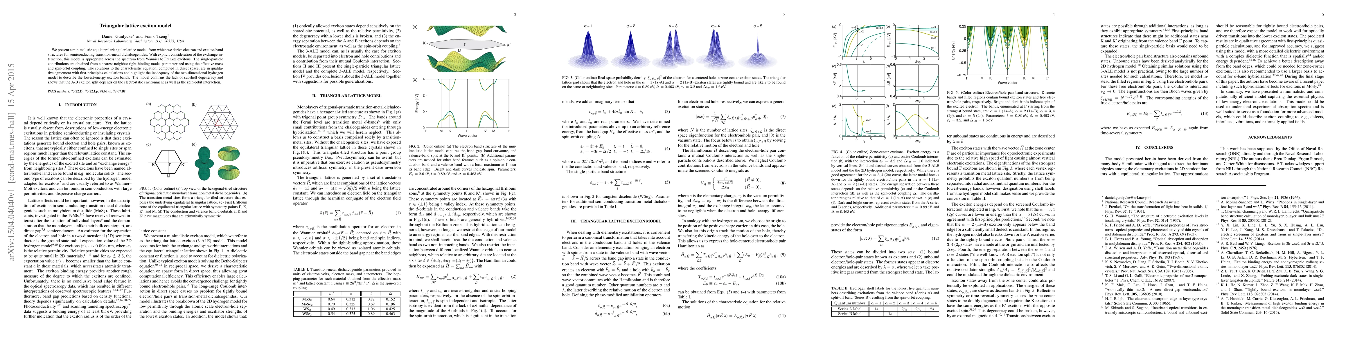 We present a minimalistic equilateral triangular lattice model, from which we derive electron and exciton band structures for semiconducting transition-metal dichalcogenides. With explicit consideration of the exchange interaction, this model is appropriate across the spectrum from Wannier to Frenkel excitons. The single-particle contributions are obtained from a nearest-neighbor tight-binding model parameterized using the effective mass and spin-orbit coupling. The solutions to the characteristic equation, computed in direct space, are in qualitative agreement with first-principles calculations and highlight the inadequacy of the two-dimensional hydrogen model to describe the lowest-energy exciton bands. The model confirms the lack of subshell degeneracy and shows that the A-B exciton split depends on the electrostatic environment as well as the spin-orbit interaction.