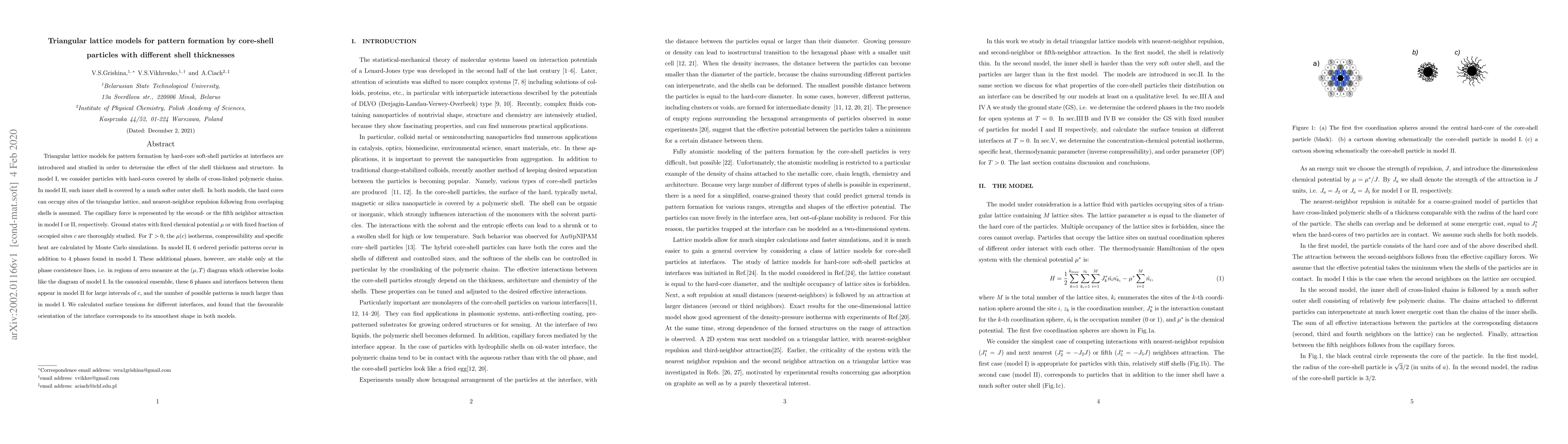 Researchers developed triangular lattice models to study pattern formation by core-shell particles at interfaces, finding that varying shell thickness affects the number and stability of patterns, with model II exhibiting 6 additional ordered periodic phases.
