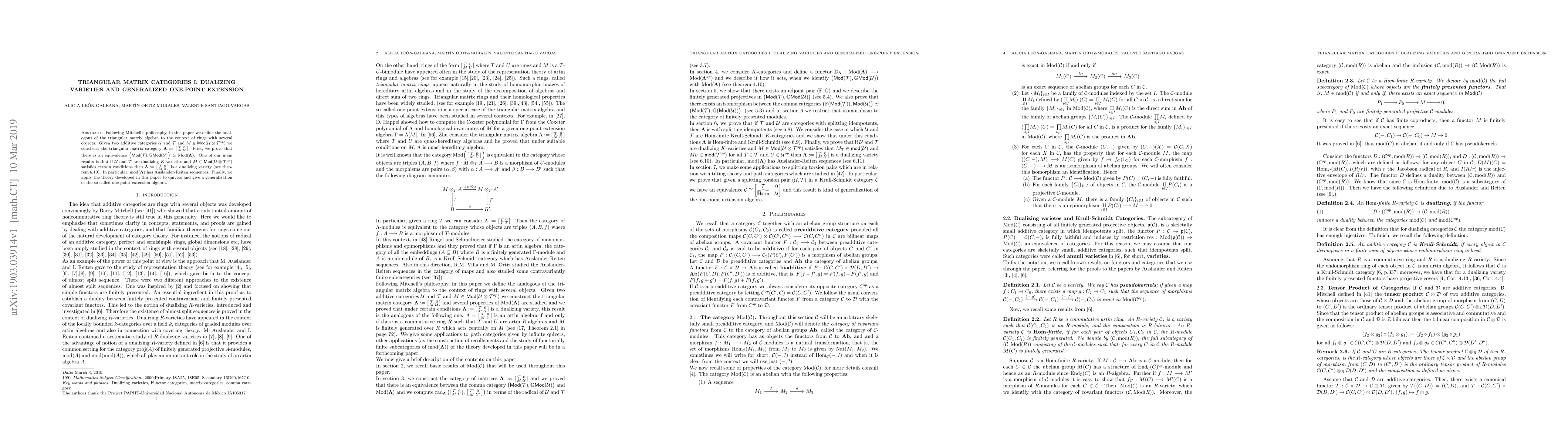 Following Mitchell's philosophy, in this paper we define the analogous of the triangular matrix algebra to the context of rings with several objects. Given two additive categories $\mathcal{U}$ and $\mathcal{T}$ and $M\in \mathsf{Mod}(\mathcal{U}\otimes \mathcal{T}^{op})$ we construct the triangular matrix category $\mathbf{\Lambda}:=\left[\begin{smallmatrix} \mathcal{T} & 0 \\ M & \mathcal{U} \end{smallmatrix}\right]$. First, we prove that there is an equivalence $\Big( \mathsf{Mod}(\mathcal{T}), \mathbb{G}\mathsf{Mod}(\mathcal{U})\Big) \simeq \mathrm{Mod}(\mathbf{\Lambda})$. One of our main results is that if $\mathcal{U}$ and $\mathcal{T}$ are dualizing $K$-varieties and $M\in \mathsf{Mod}(\mathcal{U}\otimes \mathcal{T}^{op})$ satisfies certain conditions then $\mathbf{\Lambda}:=\left[\begin{smallmatrix} \mathcal{T} & 0 \\ M & \mathcal{U} \end{smallmatrix}\right]$ is a dualizing variety (see theorem 6.10). In particular, $\mathrm{mod}(\mathbf{\Lambda})$ has Auslander-Reiten sequences. Finally, we apply the theory developed in this paper to quivers and give a generalization of the so called one-point extension algebra.
