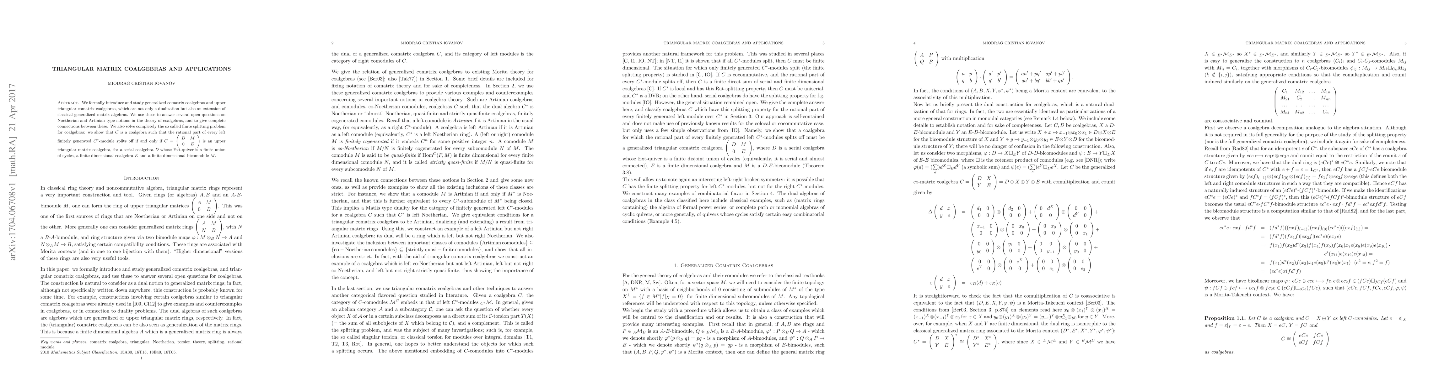 This paper explores generalized and upper triangular comatrix coalgebras, providing dualizations and extensions of classical matrix algebras. It resolves the finite splitting problem for coalgebras by showing that a coalgebra's rational part of finitely generated modules splits if it forms an upper triangular matrix coalgebra structure involving specific serial and finite-dimensional components.