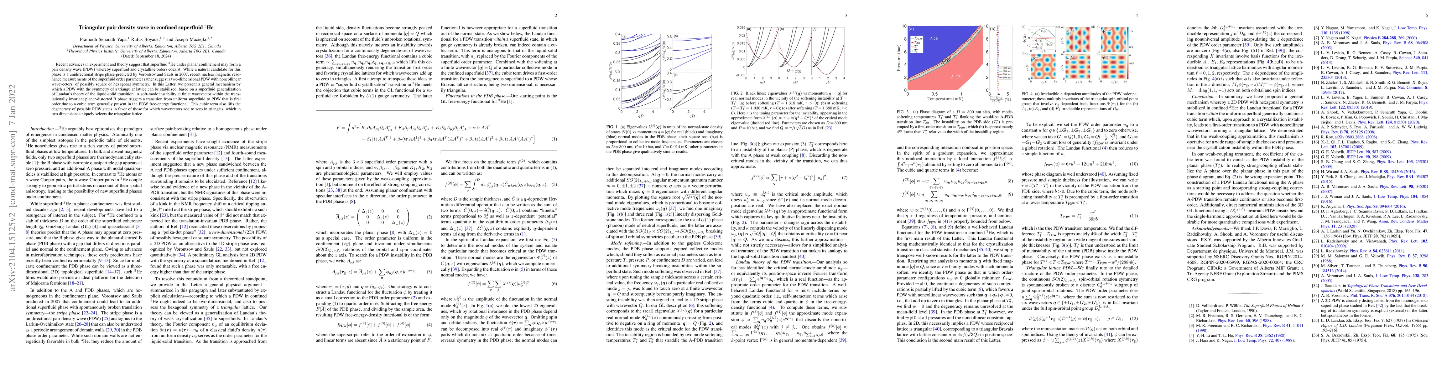 Recent advances in experiment and theory suggest that superfluid $^3$He under planar confinement may form a pair density wave (PDW) whereby superfluid and crystalline orders coexist. While a natural candidate for this phase is a unidirectional stripe phase predicted by Vorontsov and Sauls in 2007, recent nuclear magnetic resonance measurements of the superfluid order parameter rather suggest a two-dimensional PDW with noncollinear wavevectors, of possibly square or hexagonal symmetry. In this Letter, we present a general mechanism by which a PDW with the symmetry of a triangular lattice can be stabilized, based on a superfluid generalization of Landau's theory of the liquid-solid transition. A soft-mode instability at finite wavevector within the translationally invariant planar-distorted B phase triggers a transition from uniform superfluid to PDW that is first order due to a cubic term generally present in the PDW free-energy functional. This cubic term also lifts the degeneracy of possible PDW states in favor of those for which wavevectors add to zero in triangles, which in two dimensions uniquely selects the triangular lattice.