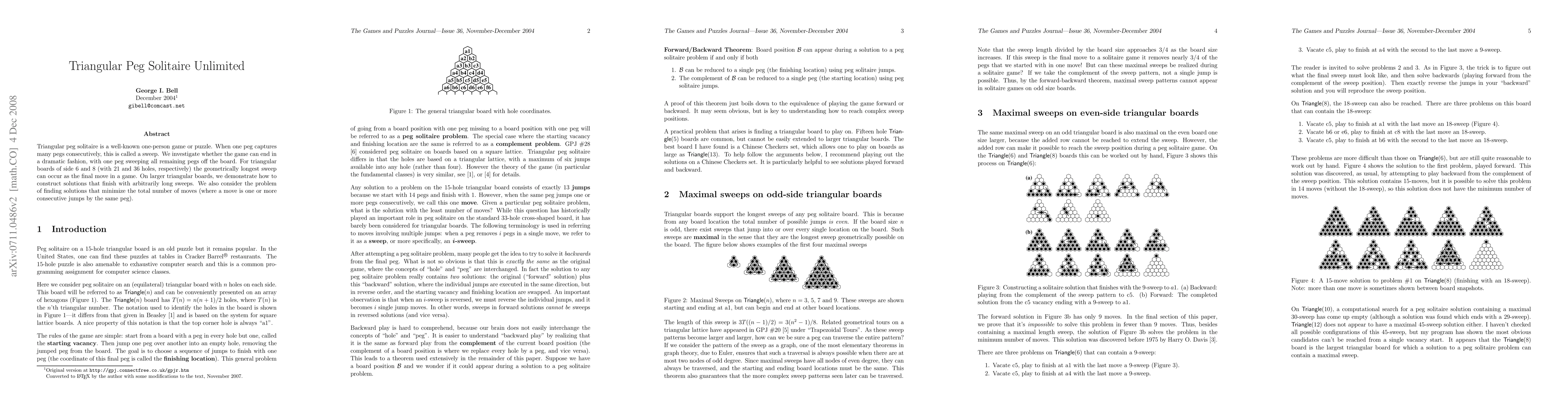 Triangular peg solitaire is a well-known one-person game or puzzle. When one peg captures many pegs consecutively, this is called a sweep. We investigate whether the game can end in a dramatic fashion, with one peg sweeping all remaining pegs off the board. For triangular boards of side 6 and 8 (with 21 and 36 holes, respectively) the geometrically longest sweep can occur as the final move in a game. On larger triangular boards, we demonstrate how to construct solutions that finish with arbitrarily long sweeps. We also consider the problem of finding solutions that minimize the total number of moves (where a move is one or more consecutive jumps by the same peg).