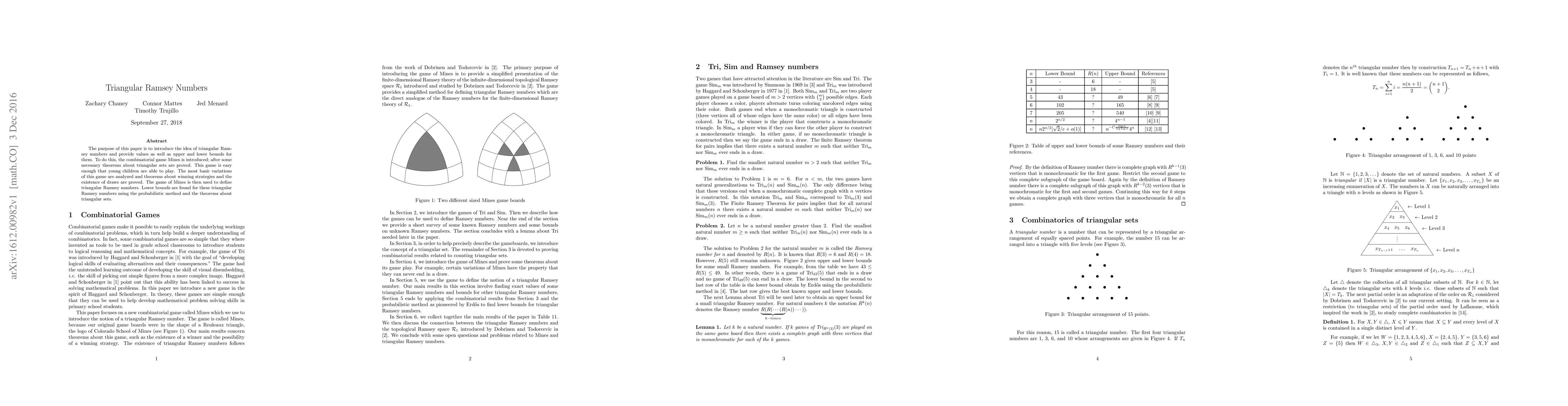 The purpose of this paper is to introduce the idea of triangular Ramsey numbers and provide values as well as upper and lower bounds for them. To do this, the combinatorial game Mines is introduced; after some necessary theorems about triangular sets are proved. This game is easy enough that young children are able to play. The most basic variations of this game are analyzed and theorems about winning strategies and the existence of draws are proved. The game of Mines is then used to define triangular Ramsey numbers. Lower bounds are found for these triangular Ramsey numbers using the probabilistic method and the theorems about triangular sets.