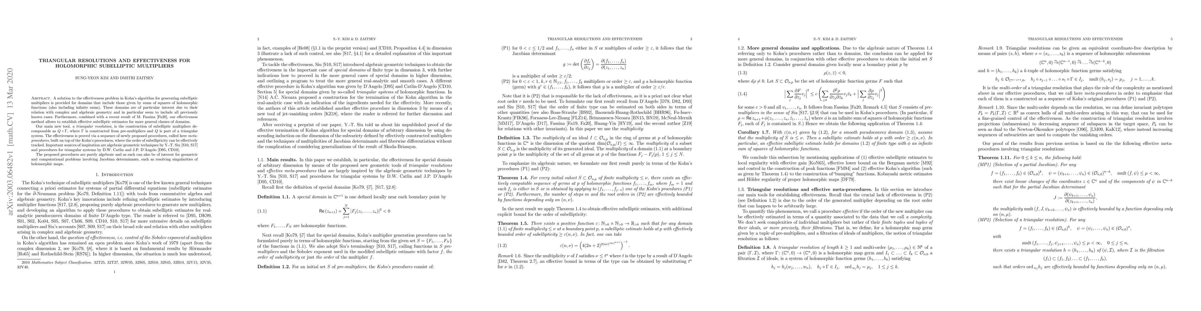 This research paper solves the effectiveness problem in Kohn's algorithm for generating subelliptic multipliers, providing a new tool called triangular resolution that allows effective estimates for domains including sums of squares of holomorphic functions.