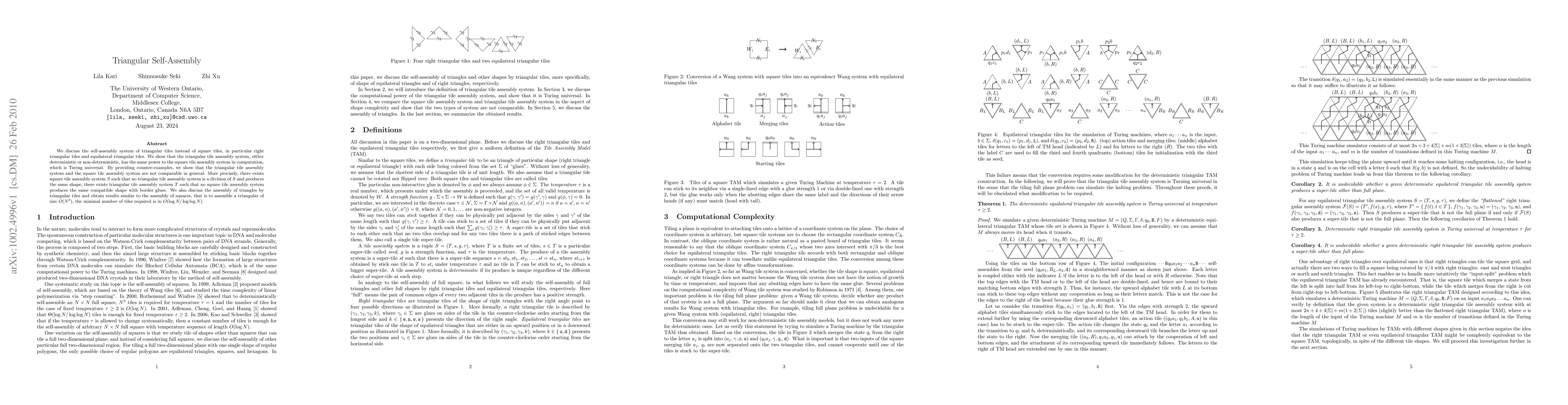 This paper explores the computational power of triangular tile self-assembly systems, demonstrating they are Turing universal, comparable to square tile systems in computational capability. It provides examples showing that triangular and square tile systems are not directly comparable, and discusses the minimal number of tiles required for assembling triangular shapes.