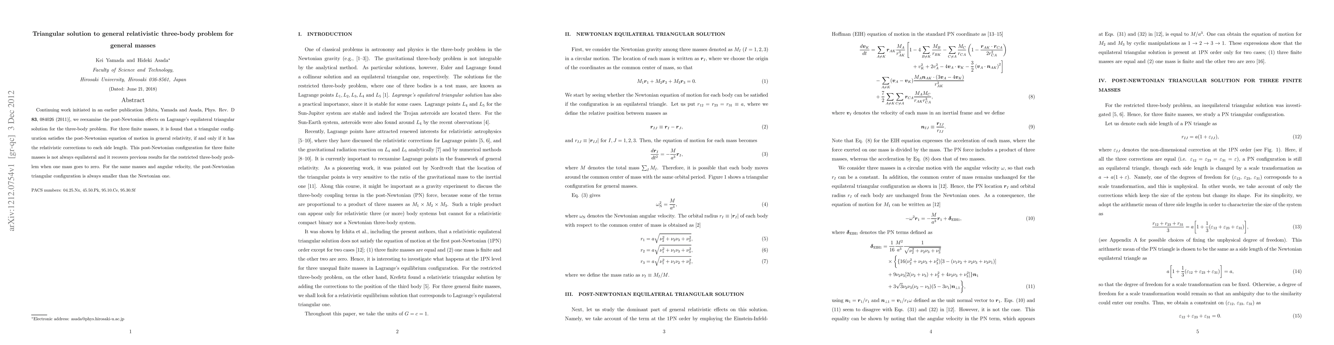 Continuing work initiated in an earlier publication [Ichita, Yamada and Asada, Phys. Rev. D 83, 084026 (2011)], we reexamine the post-Newtonian effects on Lagrange's equilateral triangular solution for the three-body problem. For three finite masses, it is found that a triangular configuration satisfies the post-Newtonian equation of motion in general relativity, if and only if it has the relativistic corrections to each side length. This post-Newtonian configuration for three finite masses is not always equilateral and it recovers previous results for the restricted three-body problem when one mass goes to zero. For the same masses and angular velocity, the post-Newtonian triangular configuration is always smaller than the Newtonian one.