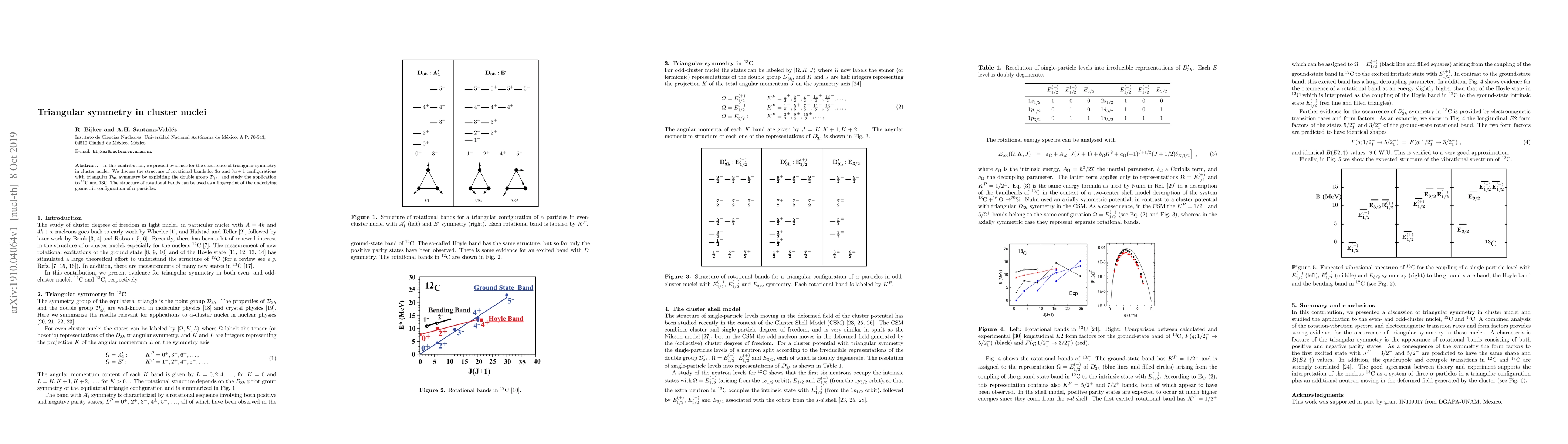 The paper presents evidence for triangular symmetry in cluster nuclei, specifically in 12C and 13C, by analyzing rotational bands for 3-alpha and 3-alpha+1 configurations using D'(3h) double group. This symmetry serves as a fingerprint for alpha-particle configurations.
