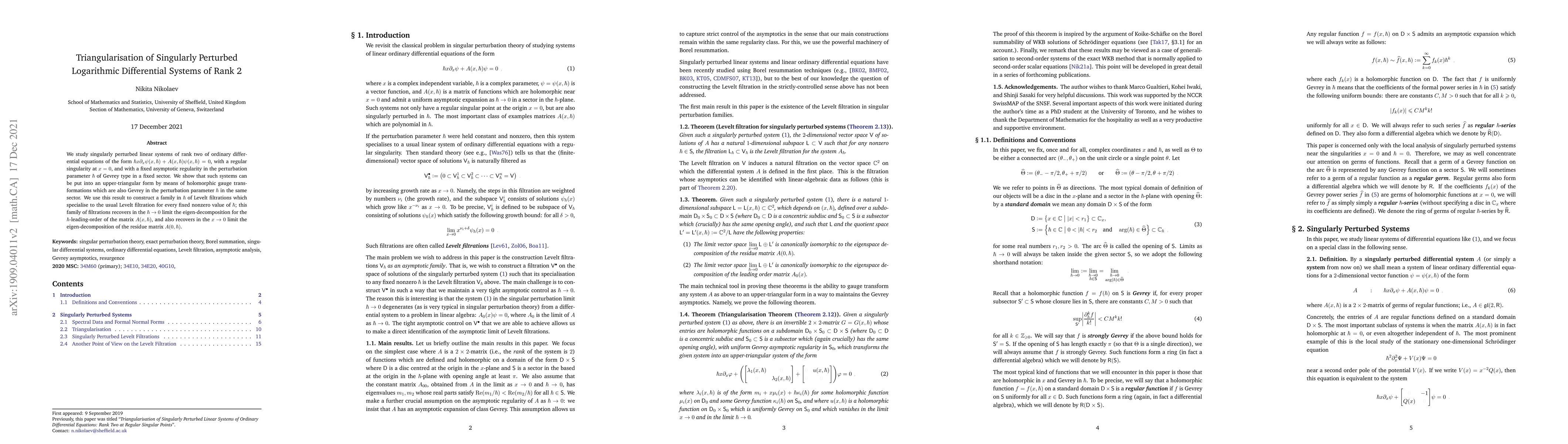 We study singularly perturbed linear systems of rank two of ordinary differential equations of the form $\hbar x\partial_x \psi (x, \hbar) + A (x, \hbar) \psi (x, \hbar) = 0$, with a regular singularity at $x = 0$, and with a fixed asymptotic regularity in the perturbation parameter $\hbar$ of Gevrey type in a fixed sector. We show that such systems can be put into an upper-triangular form by means of holomorphic gauge transformations which are also Gevrey in the perturbation parameter $\hbar$ in the same sector. We use this result to construct a family in $\hbar$ of Levelt filtrations which specialise to the usual Levelt filtration for every fixed nonzero value of $\hbar$; this family of filtrations recovers in the $\hbar \to 0$ limit the eigen-decomposition for the $\hbar$-leading-order of the matrix $A (x, \hbar)$, and also recovers in the $x \to 0$ limit the eigen-decomposition of the residue matrix $A (0, \hbar)$.