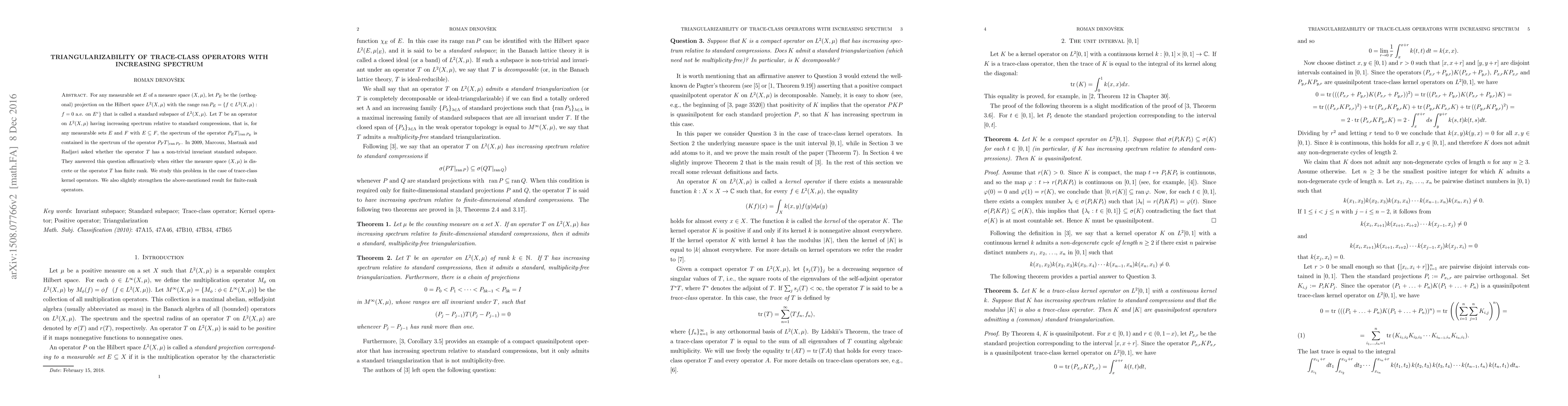 For any measurable set $E$ of a measure space $(X, \mu)$, let $P_E$ be the (orthogonal) projection on the Hilbert space $L^2(X, \mu)$ with the range $ran \, P_E = \{f \in L^2(X, \mu) : f = 0 \ \ a.e. \ on \ E^c\}$ that is called a standard subspace of $L^2(X, \mu)$. Let $T$ be an operator on $L^2(X, \mu)$ having increasing spectrum relative to standard compressions, that is, for any measurable sets $E$ and $F$ with $E \subseteq F$, the spectrum of the operator $P_E T|_{ran \, P_E}$ is contained in the spectrum of the operator $P_F T|_{ran \, P_F}$. In 2009, Marcoux, Mastnak and Radjavi asked whether the operator $T$ has a non-trivial invariant standard subspace. They answered this question affirmatively when either the measure space $(X, \mu)$ is discrete or the operator $T$ has finite rank. We study this problem in the case of trace-class kernel operators. We also slightly strengthen the above-mentioned result for finite-rank operators.
