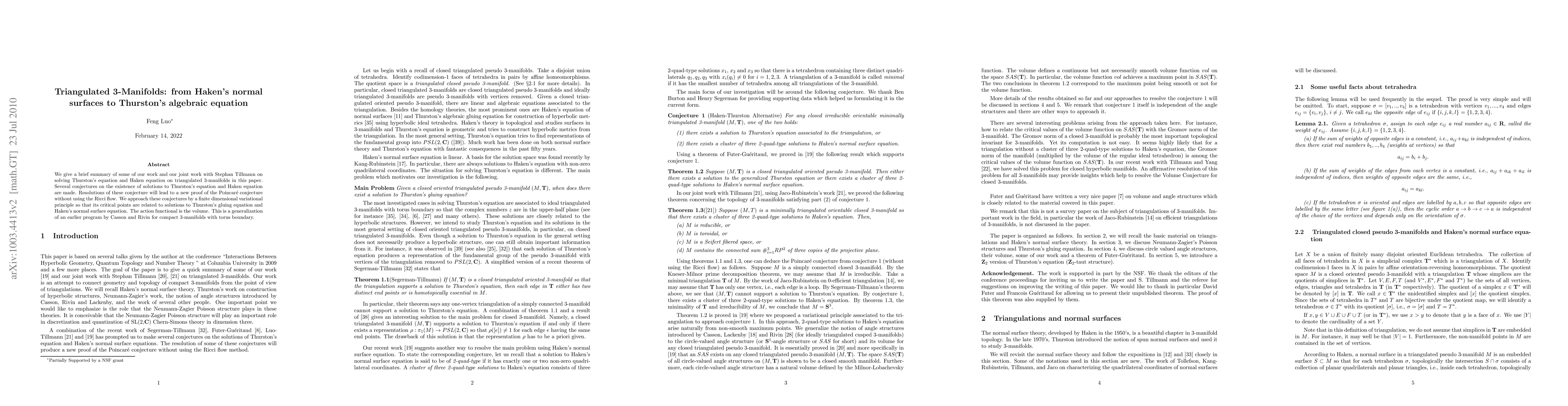 We give a brief summary of some of our work and our joint work with Stephan Tillmann on solving Thurston's equation and Haken equation on triangulated 3-manifolds in this paper. Several conjectures on the existence of solutions to Thurston's equation and Haken equation are made. Resolutions of these conjecture will lead to a new proof of the Poincar\'e conjecture without using the Ricci flow. We approach these conjectures by a finite dimensional variational principle so that its critical points are related to solutions to Thurston's gluing equation and Haken's normal surface equation. The action functional is the volume. This is a generalization of an earlier program by Casson and Rivin for compact 3-manifolds with torus boundary.