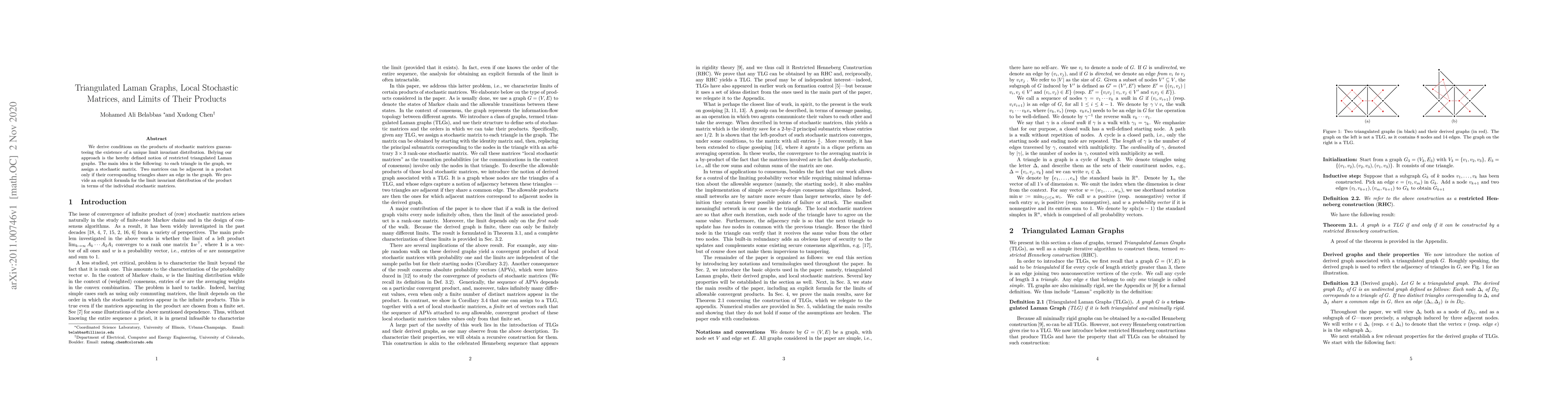 We derive conditions on the products of stochastic matrices guaranteeing the existence of a unique limit invariant distribution. Belying our approach is the hereby defined notion of restricted triangulated Laman graphs. The main idea is the following: to each triangle in the graph, we assign a stochastic matrix. Two matrices can be adjacent in a product only if their corresponding triangles share an edge in the graph. We provide an explicit formula for the limit invariant distribution of the product in terms of the individual stochastic matrices.