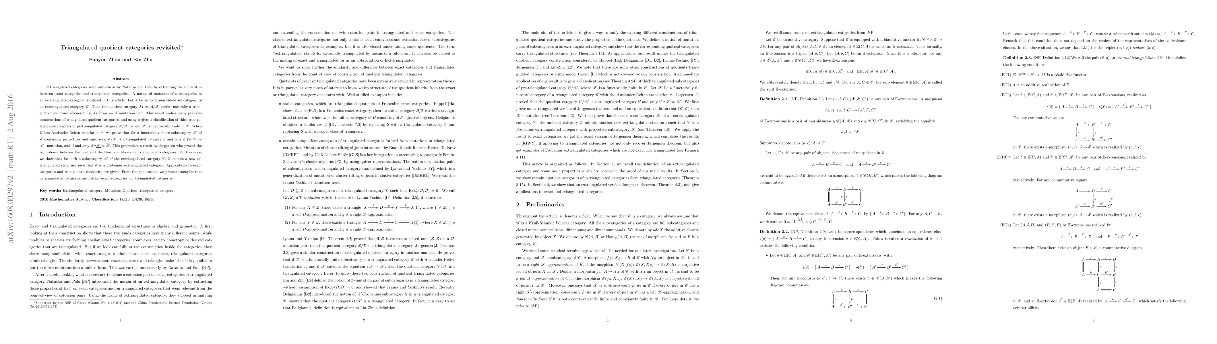 This paper defines mutation of subcategories in extriangulated categories and shows that quotient categories inherit a triangulated structure under certain conditions. It classifies thick triangulated subcategories and establishes conditions for the triangulated nature of quotients, generalizing previous results and proving new structures for extriangulated categories.