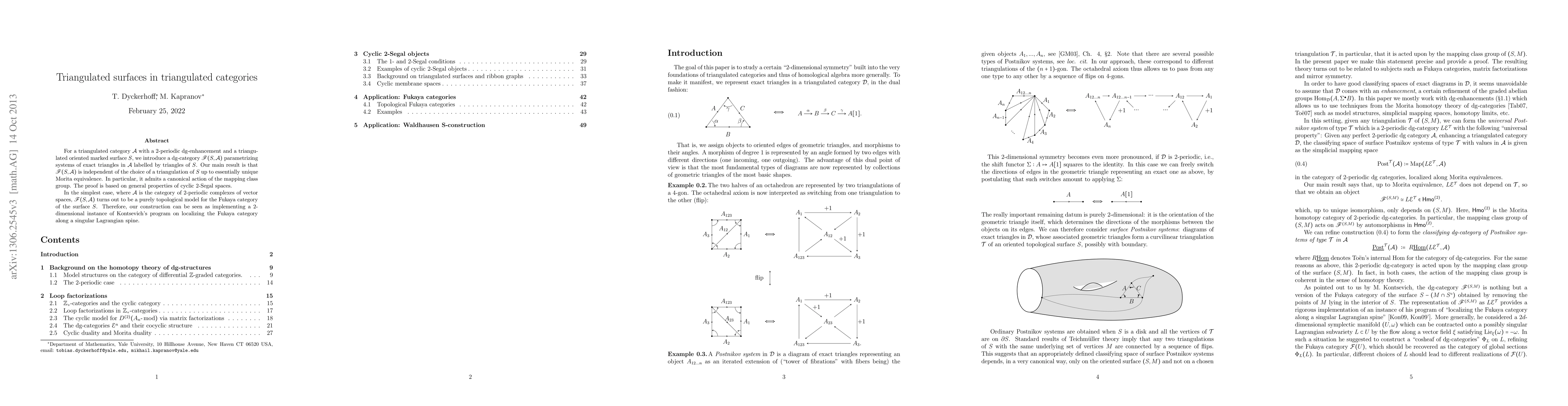 For a triangulated category A with a 2-periodic dg-enhancement and a triangulated oriented marked surface S we introduce a dg-category F(S,A) parametrizing systems of exact triangles in A labelled by triangles of S. Our main result is that F(S,A) is independent on the choice of a triangulation of S up to essentially unique Morita equivalence. In particular, it admits a canonical action of the mapping class group. The proof is based on general properties of cyclic 2-Segal spaces. In the simplest case, where A is the category of 2-periodic complexes of vector spaces, F(S,A) turns out to be a purely topological model for the Fukaya category of the surface S. Therefore, our construction can be seen as implementing a 2-dimensional instance of Kontsevich's program on localizing the Fukaya category along a singular Lagrangian spine.