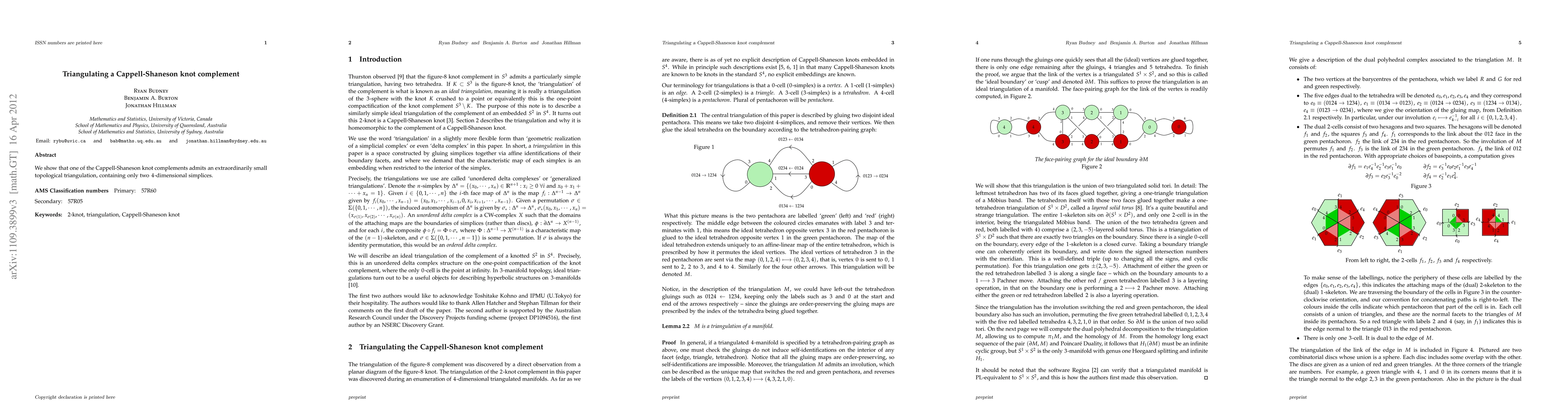 Summary: This paper demonstrates that a specific Cappell-Shaneson knot complement can be triangulated with an exceptionally small structure, comprising just two 4-dimensional simplices. This finding highlights a remarkable geometric property of the knot's complement.