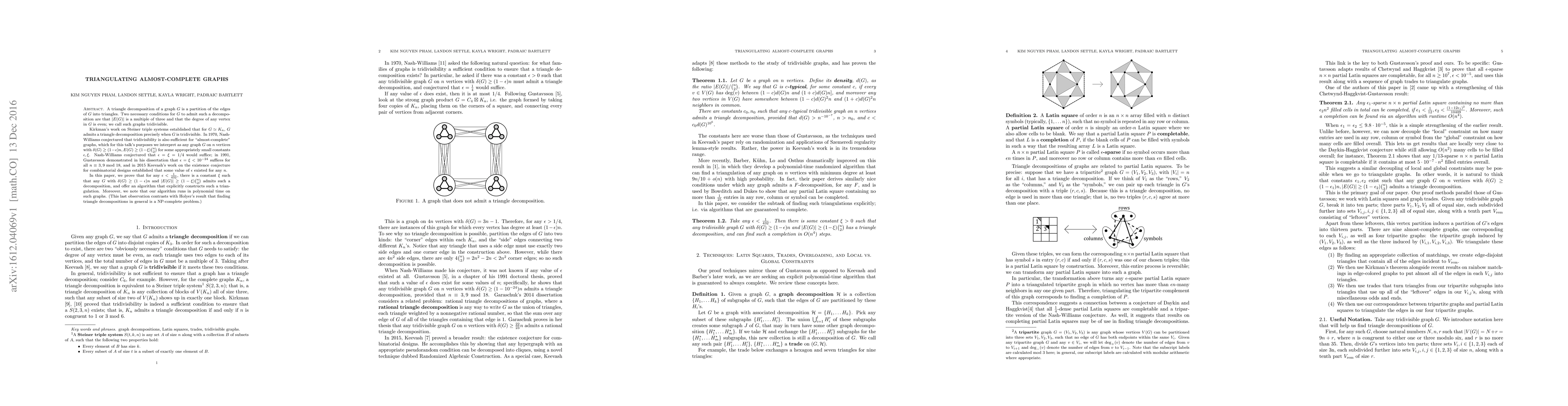 A triangle decomposition of a graph $G$ is a partition of the edges of $G$ into triangles. Two necessary conditions for $G$ to admit such a decomposition are that $|E(G)|$ is a multiple of three and that the degree of any vertex in $G$ is even; we call such graphs tridivisible. Kirkman's work on Steiner triple systems established that for $G \simeq K_n$, $G$ admits a triangle decomposition precisely when $G$ is tridivisible. In 1970, Nash-Williams conjectured that tridivisiblity is also sufficient for "almost-complete" graphs, which for this talk's purposes we interpret as any graph $G$ on $n$ vertices with $\delta(G) \geq (1 -\epsilon)n, E(G) \geq (1 - \xi)\binom{n}{2}$ for some appropriately small constants $\epsilon, \xi$. Nash-Williams conjectured that $\epsilon = \xi =1/4$ would suffice; in 1991, Gustavsson demonstrated in his dissertation that $\epsilon = \xi < 10^{-24}$ suffices for all $n \equiv 3, 9 \mod 18$, and in 2015 Keevash's work on the existence conjecture for combinatorial designs established that some value of $\epsilon$ existed for any $n$. In this paper, we prove that for any $\epsilon < \frac{1}{432}$, there is a constant $\xi$ such that any $G$ with $\delta(G) \geq (1 - \epsilon)n$ and $|E(G)| \geq (1 - \xi)\binom{n}{2}$ admits such a decomposition, and offer an algorithm that explicitly constructs such a triangulation. Moreover, we note that our algorithm runs in polynomial time on such graphs. (This last observation contrasts with Holyer's result that finding triangle decompositions in general is a NP-complete problem.)
