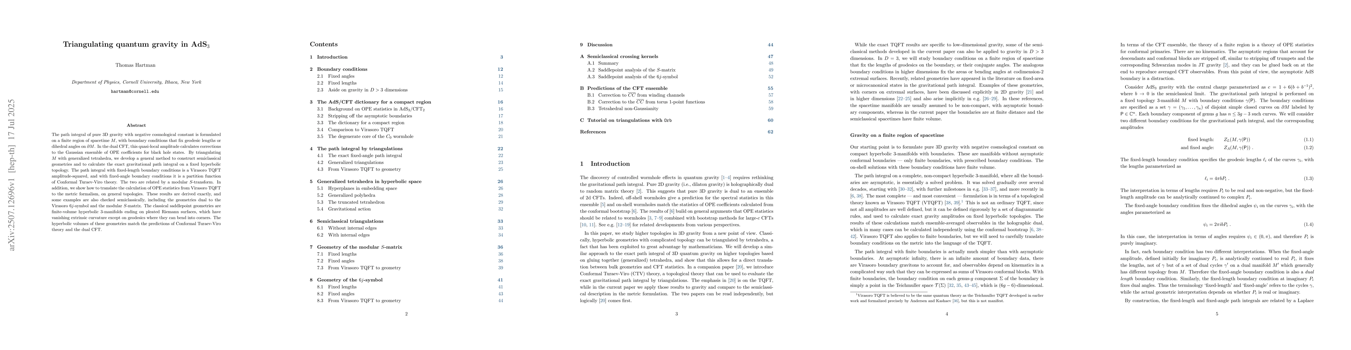 The path integral of pure 3D gravity with negative cosmological constant is formulated on a finite region of spacetime $M$, with boundary conditions that fix geodesic lengths or dihedral angles on $\partial M$. In the dual CFT, this quasi-local amplitude calculates corrections to the Gaussian ensemble of OPE coefficients for black hole states. By triangulating $M$ with generalized tetrahedra, we develop a general method to construct semiclassical geometries and to calculate the exact gravitational path integral on a fixed hyperbolic topology. The path integral with fixed-length boundary conditions is a Virasoro TQFT amplitude-squared, and with fixed-angle boundary conditions it is a partition function of Conformal Turaev-Viro theory. The two are related by a modular S-transform. In addition, we show how to translate the calculation of OPE statistics from Virasoro TQFT to the metric formalism, on general topologies. These results are derived exactly, and some examples are also checked semiclassically, including the geometries dual to the Virasoro 6j-symbol and the modular S-matrix. The classical saddlepoint geometries are finite-volume hyperbolic 3-manifolds ending on pleated Riemann surfaces, which have vanishing extrinsic curvature except on geodesics where they can bend into corners. The hyperbolic volumes of these geometries match the predictions of Conformal Turaev-Viro theory and the dual CFT.