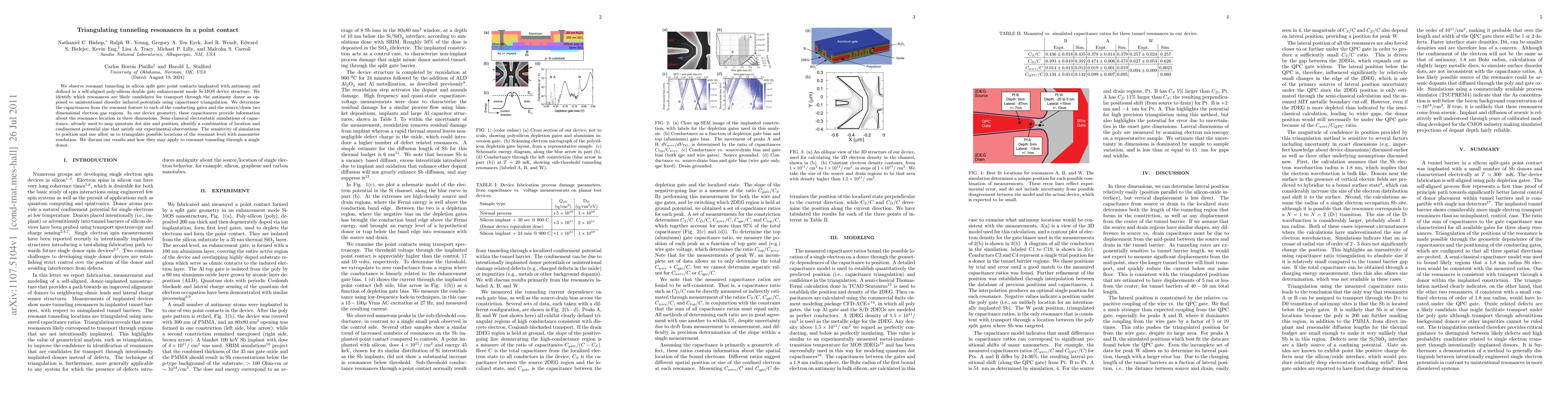 We observe resonant tunneling in silicon split gate point contacts implanted with antimony and defined in a self-aligned poly-silicon double gate enhancement mode Si-MOS device structure. We identify which resonances are likely candidates for transport through the antimony donor as opposed to unintentional disorder induced potentials using capacitance triangulation. We determine the capacitances from the resonant feature to each of the conducting gates and the source/drain two dimensional electron gas regions. In our device geometry, these capacitances provide information about the resonance location in three dimensions. Semi-classical electrostatic simulations of capacitance, already used to map quantum dot size and position, identify a combination of location and confinement potential size that satisfy our experimental observations. The sensitivity of simulation to position and size allow us to triangulate possible locations of the resonant level with nanometer resolution. We discuss our results and how they may apply to resonant tunneling through a single donor.