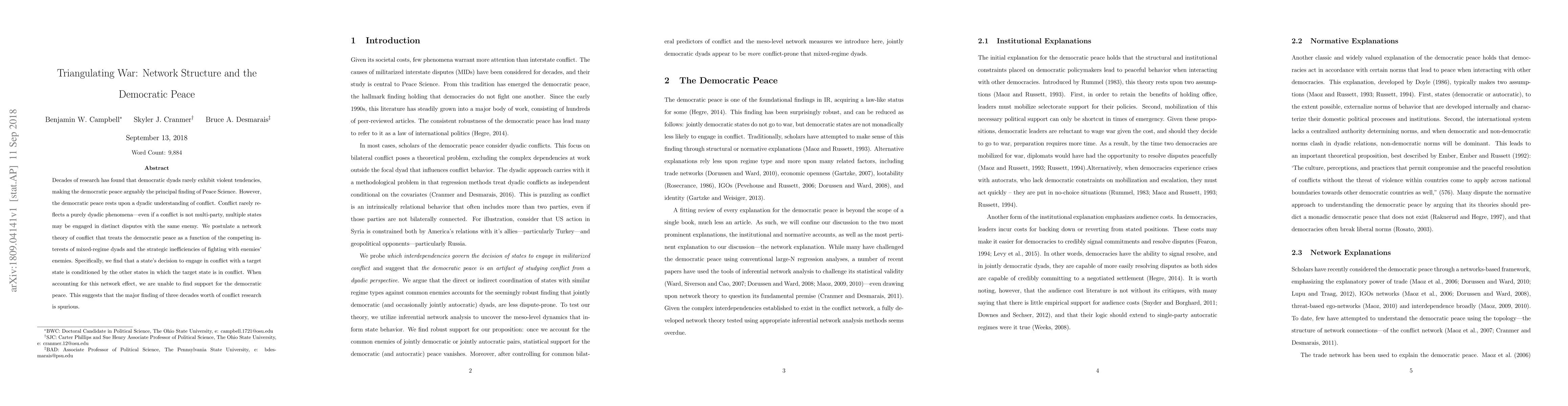 This paper challenges the democratic peace theory by introducing a network theory of conflict, arguing that the democratic peace is not robust when considering the broader network of interactions among states. The study finds no support for the democratic peace when accounting for the strategic implications of a state's relationships with other conflicting states.