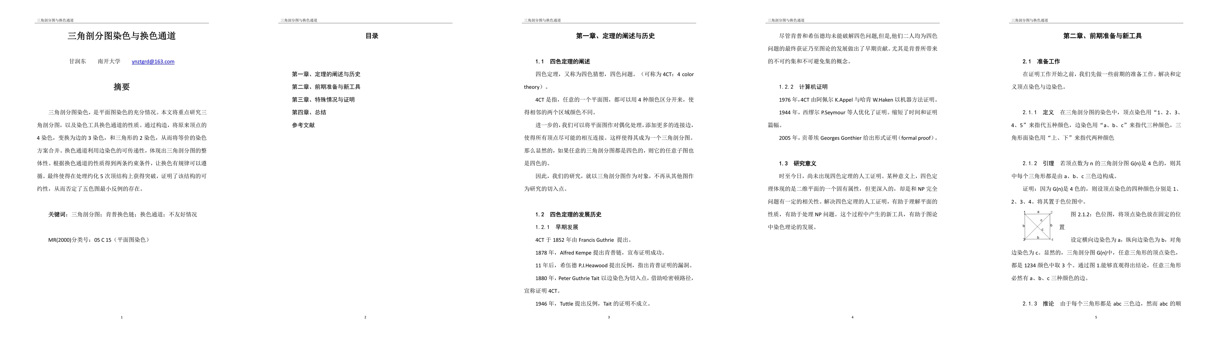 Triangulation graph staining is sufficient for planar graph staining. This article will focus on triangulation and the nature of the color change channel of the staining tool. By construction, the four colors of the vertex are converted into three colors of the side, and two colors of the triangle. Thereby the equivalent dyeing scheme is combined. The color change channel utilizes the transferability of edge dyeing to reflect the integrity of the triangulation graph. According to the nature of the color change channel, two constraints are obtained, so that the color change can be followed regularly. Eventually, a breakthrough was made in the structure of the reduced d(v)=5, which proves the reducible of this structure. This negates the existence of the smallest counterexample.
