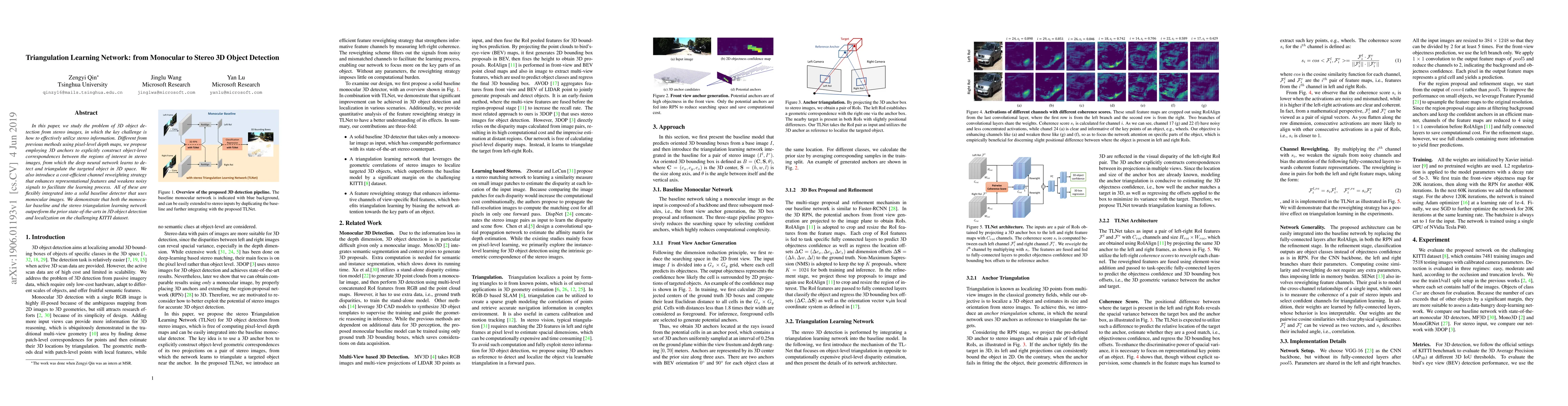 This paper proposes a Triangulation Learning Network for 3D object detection from stereo images, using 3D anchors to construct object-level correspondences and a channel reweighting strategy to enhance feature representation. The method outperforms prior state-of-the-art detectors on the KITTI dataset.