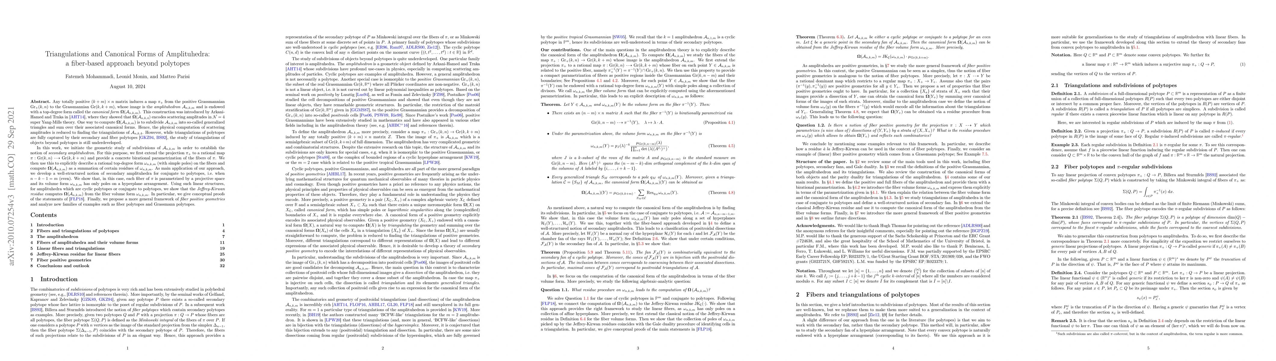 Any totally positive $(k+m)\times n$ matrix induces a map $\pi_+$ from the positive Grassmannian ${\rm Gr}_+(k,n)$ to the Grassmannian ${\rm Gr}(k,k+m)$, whose image is the amplituhedron $\mathcal{A}_{n,k,m}$ and is endowed with a top-degree form called the canonical form ${\bf\Omega}(\mathcal{A}_{n,k,m})$. This construction was introduced by Arkani-Hamed and Trnka, where they showed that ${\bf\Omega}(\mathcal{A}_{n,k,4})$ encodes scattering amplitudes in $\mathcal{N}=4$ super Yang-Mills theory. Moreover, the computation of ${\bf\Omega}(\mathcal{A}_{n,k,m})$ is reduced to finding the triangulations of $\mathcal{A}_{n,k,m}$. However, while triangulations of polytopes are fully captured by their secondary polytopes, the study of triangulations of objects beyond polytopes is still underdeveloped. We initiate the geometric study of subdivisions of $\mathcal{A}_{n,k,m}$ and provide a concrete birational parametrization of fibers of $\pi: {\rm Gr}(k,n)\dashrightarrow {\rm Gr}(k,k+m)$. We then use this to explicitly describe a rational top-degree form $\omega_{n,k,m}$ (with simple poles) on the fibers and compute ${\bf\Omega}(\mathcal{A}_{n,k,m})$ as a summation of certain residues of $\omega_{n,k,m}$. As main application of our approach, we develop a well-structured notion of secondary amplituhedra for conjugate to polytopes, i.e. when $n-k-1=m$ (even). We show that, in this case, each fiber of $\pi$ is parametrized by a projective space and its volume form $\omega_{n,k,m}$ has only poles on a hyperplane arrangement. Using such linear structures, for amplituhedra which are cyclic polytopes or conjugate to polytopes, we show that the Jeffrey-Kirwan residue computes ${\bf\Omega}(\mathcal{A}_{n,k,m})$ from $\omega_{n,k,m}$. Finally, we propose a more general framework of fiber positive geometries and analyze new families of examples such as fiber polytopes and Grassmann polytopes.