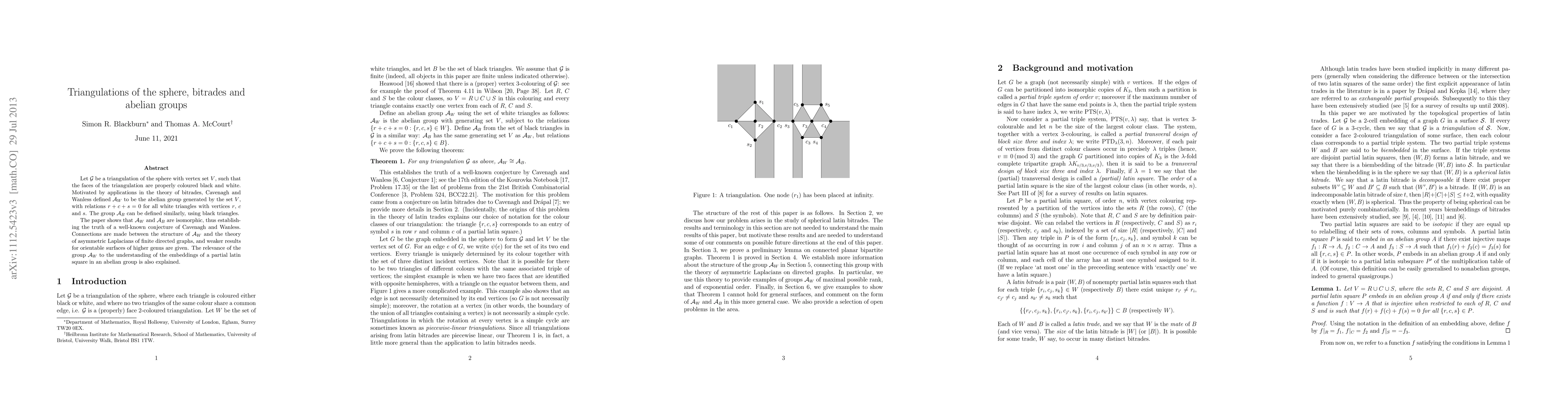 Let $G$ be a triangulation of the sphere with vertex set $V$, such that the faces of the triangulation are properly coloured black and white. Motivated by applications in the theory of bitrades, Cavenagh and Wanless defined $A_W$ to be the abelian group generated by the set $V$, with relations $r+c+s=0$ for all white triangles with vertices $r$, $c$ and $s$. The group $A_B$ can be defined similarly, using black triangles. The paper shows that $A_W$ and $A_B$ are isomorphic, thus establishing the truth of a well-known conjecture of Cavenagh and Wanless. Connections are made between the structure of $A_W$ and the theory of asymmetric Laplacians of finite directed graphs, and weaker results for orientable surfaces of higher genus are given. The relevance of the group $A_W$ to the understanding of the embeddings of a partial latin square in an abelian group is also explained.