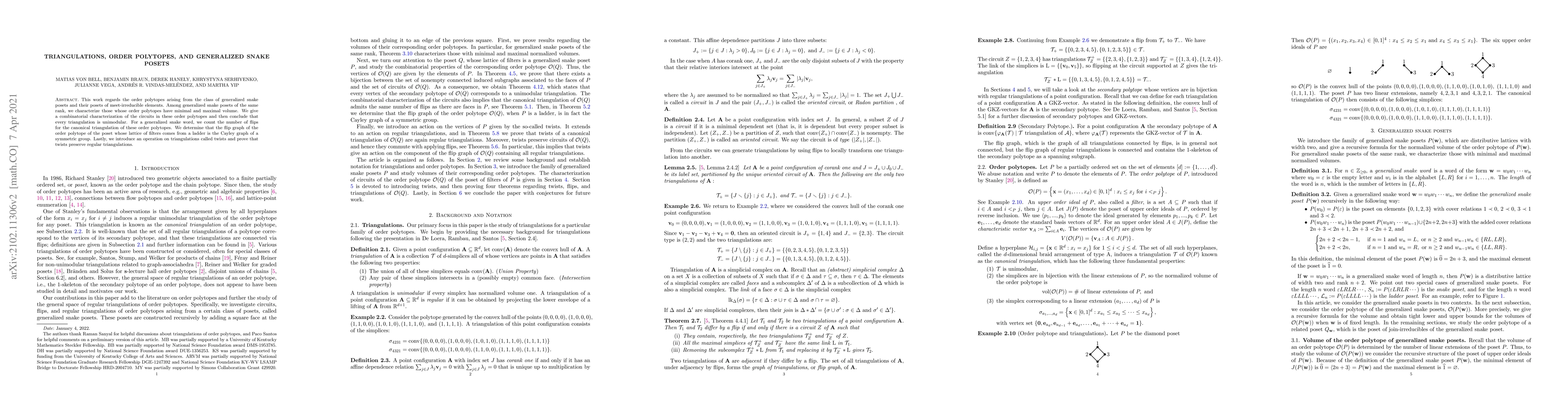 This paper investigates order polytopes from generalized snake posets, identifying those with minimal and maximal volume among the same rank. It characterizes the circuits in these polytopes, proving all triangulations are unimodular, counts flips for canonical triangulations, and demonstrates the flip graph of ladder lattices forms a symmetric group's Cayley graph. It also introduces and proves the preservation of regular triangulations under a new operation called twists.