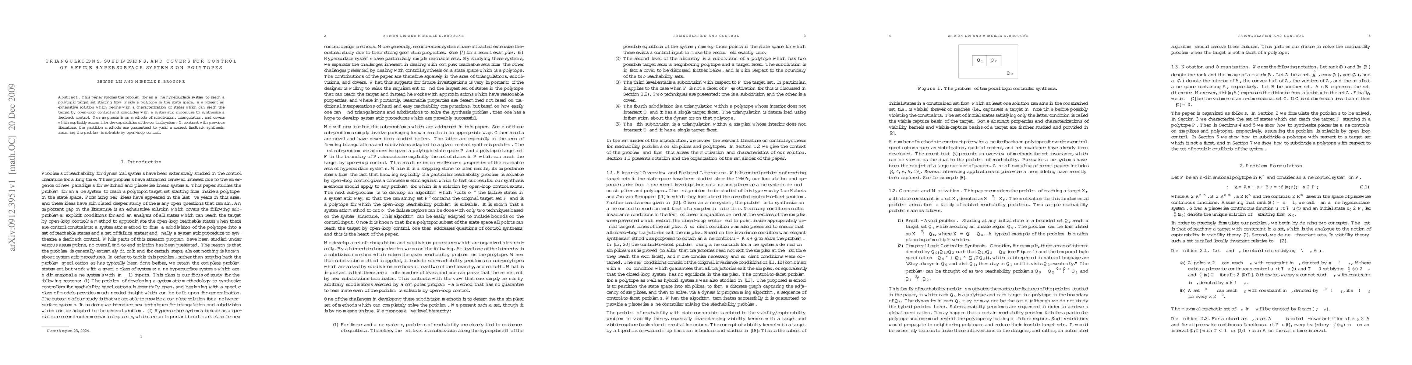 This paper studies the problem for an affine hypersurface system to reach a polytopic target set starting from inside a polytope in the state space. We present an exhaustive solution which begins with a characterization of states which can reach the target by open-loop control and concludes with a systematic procedure to synthesize a feedback control. Our emphasis is on methods of subdivision, triangulation, and covers which explicitly account for the capabilities of the control system. In contrast with previous literature, the partition methods are guaranteed to yield a correct feedback synthesis, assuming the problem is solvable by open-loop control.