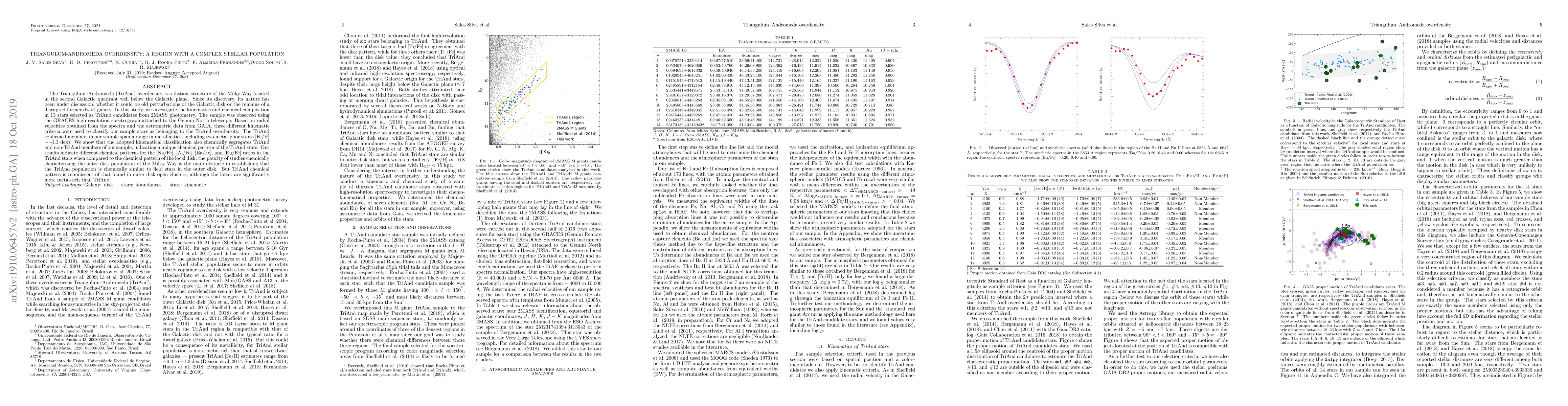 The Triangulum--Andromeda (TriAnd) overdensity is a distant structure of the Milky Way located in the second Galactic quadrant well below the Galactic plane. Since its discovery, its nature has been under discussion, whether it could be old perturbations of the Galactic disk or the remains of a disrupted former dwarf galaxy. In this study, we investigate the kinematics and chemical composition in 13 stars selected as TriAnd candidates from 2MASS photometry. The sample was observed using the GRACES high-resolution spectrograph attached to the Gemini North telescope. Based on radial velocities obtained from the spectra and the astrometric data from GAIA, three different kinematic criteria were used to classify our sample stars as belonging to the TriAnd overdensity. The TriAnd confirmed members in our sample span a range in metallicities, including two metal-poor stars ([Fe/H] $\sim$ -1.3 dex). We show that the adopted kinematical classification also chemically segregates TriAnd and non-TriAnd members of our sample, indicating a unique chemical pattern of the TriAnd stars. Our results indicate different chemical patterns for the [Na/Fe], [Al/Fe], [Ba/Fe], and [Eu/Fe] ratios in the TriAnd stars when compared to the chemical pattern of the local disk; the paucity of studies chemically characterizing the outer disk population of the Milky Way is the main obstacle in establishing that the TriAnd population is chemically similar to field stars in the outer disk. But TriAnd chemical pattern is reminiscent of that found in outer disk open clusters, although the latter are significantly more metal-rich than TriAnd.
