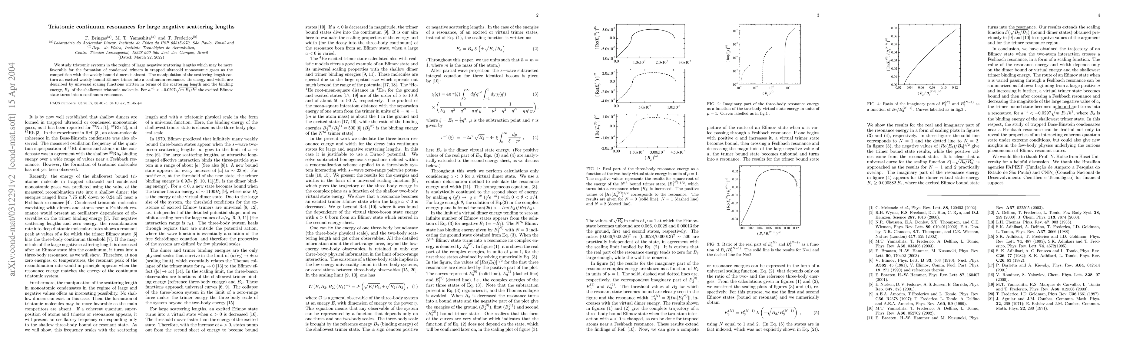 This paper investigates triatomic systems with large negative scattering lengths, showing that such conditions favor the formation of condensed trimers without competition from weakly bound dimers. It describes how manipulating the scattering length can transform an excited Efimov trimer into a continuum resonance, characterized by universal scaling functions dependent on the scattering length and the binding energy of the shallowest triatomic molecule.
