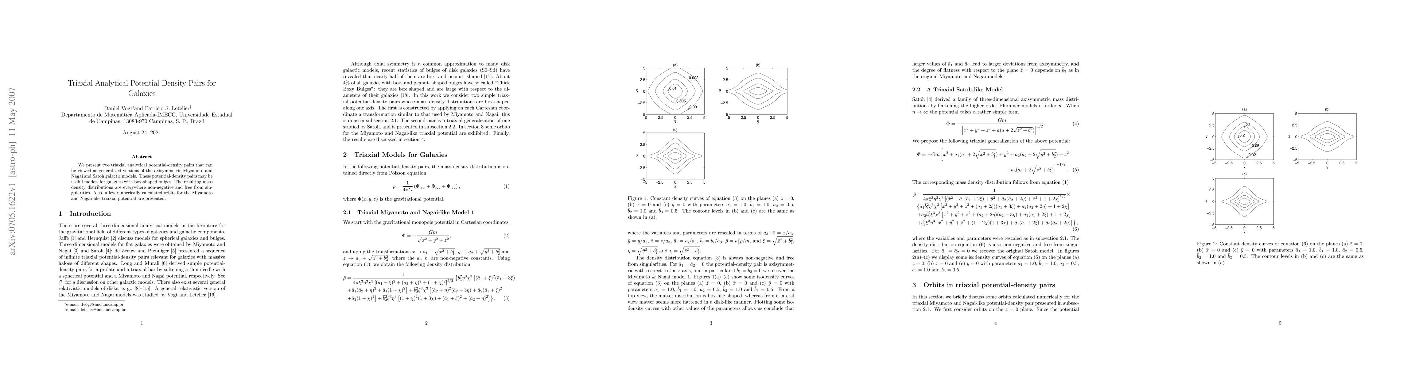 We present two triaxial analytical potential-density pairs that can be viewed as generalized versions of the axisymmetric Miyamoto and Nagai and Satoh galactic models. These potential-density pairs may be useful models for galaxies with box-shaped bulges. The resulting mass density distributions are everywhere non-negative and free from singularities. Also, a few numerically calculated orbits for the Miyamoto and Nagai-like triaxial potential are presented.