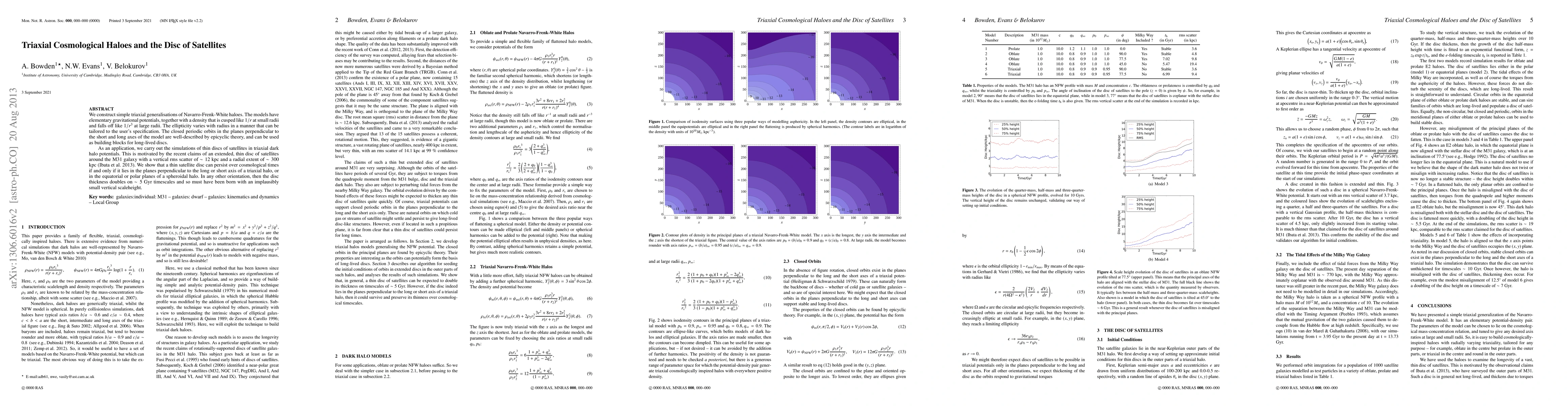 The paper constructs triaxial generalizations of Navarro-Frenk-White (NFW) halo models, with gravitational potentials and densities that are cuspy at small radii and fall off as 1/r^3 at large radii. Ellipticity varies with radius and can be customized. The models utilize epicyclic theory to describe closed periodic orbits in planes perpendicular to the short and long axes, which can form long-lived discs.