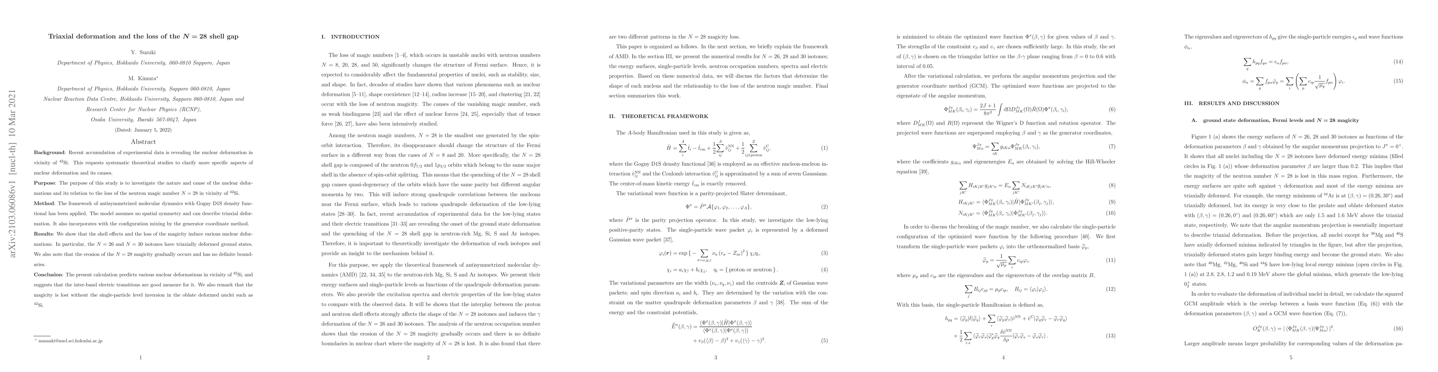 This study uses a theoretical model to investigate nuclear deformations near 42Si, finding that shell effects cause triaxial deformation in isotones around N = 28, leading to the loss of magicity without a clear boundary.
