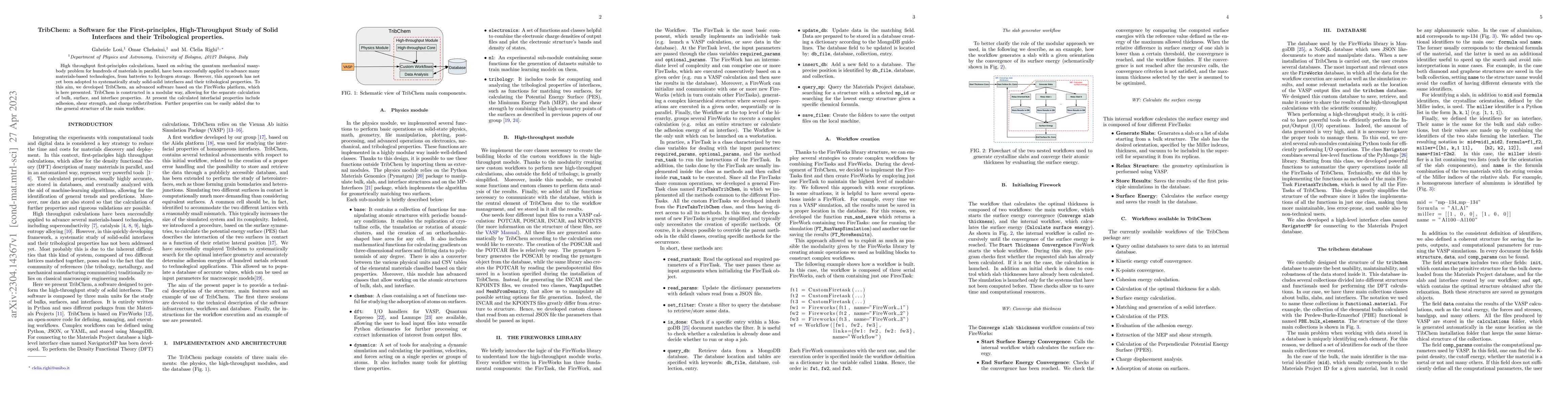 TribChem is a new software for high-throughput first-principles calculations of solid interfaces and their tribological properties, developed on the FireWorks platform. It allows for modular calculations of adhesion, shear strength, and charge redistribution at interfaces, with potential for future expansion.