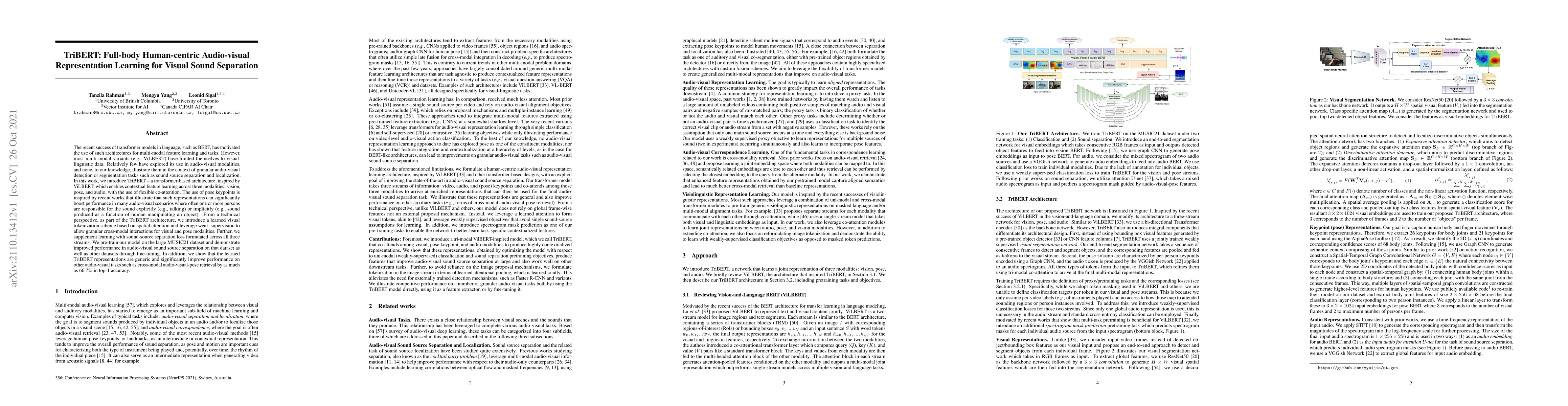 TriBERT is a transformer-based model that learns contextual features across vision, pose, and audio modalities for audio-visual tasks. It demonstrates improved performance in sound source separation and other audio-visual tasks, showing the effectiveness of integrating human pose keypoints and multi-modal co-attention.