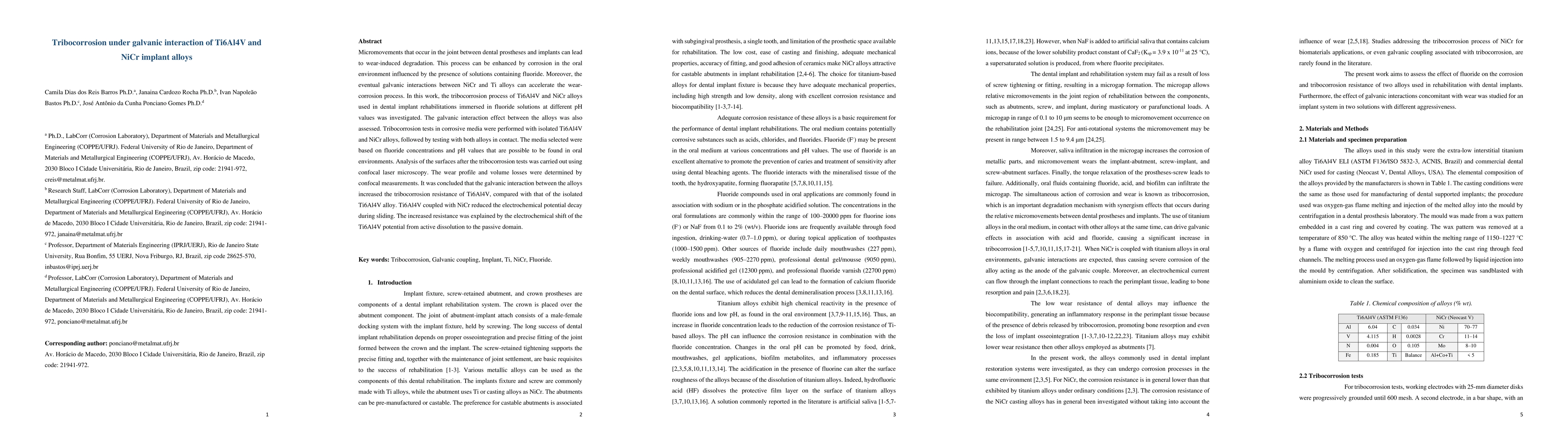This study investigates the tribocorrosion behavior of Ti6Al4V and NiCr alloys in fluoride-containing solutions simulating oral environments, highlighting the impact of galvanic interactions. Results show that coupling Ti6Al4V with NiCr enhances its tribocorrosion resistance by shifting its electrochemical potential to a passive domain, thereby reducing wear and corrosion.