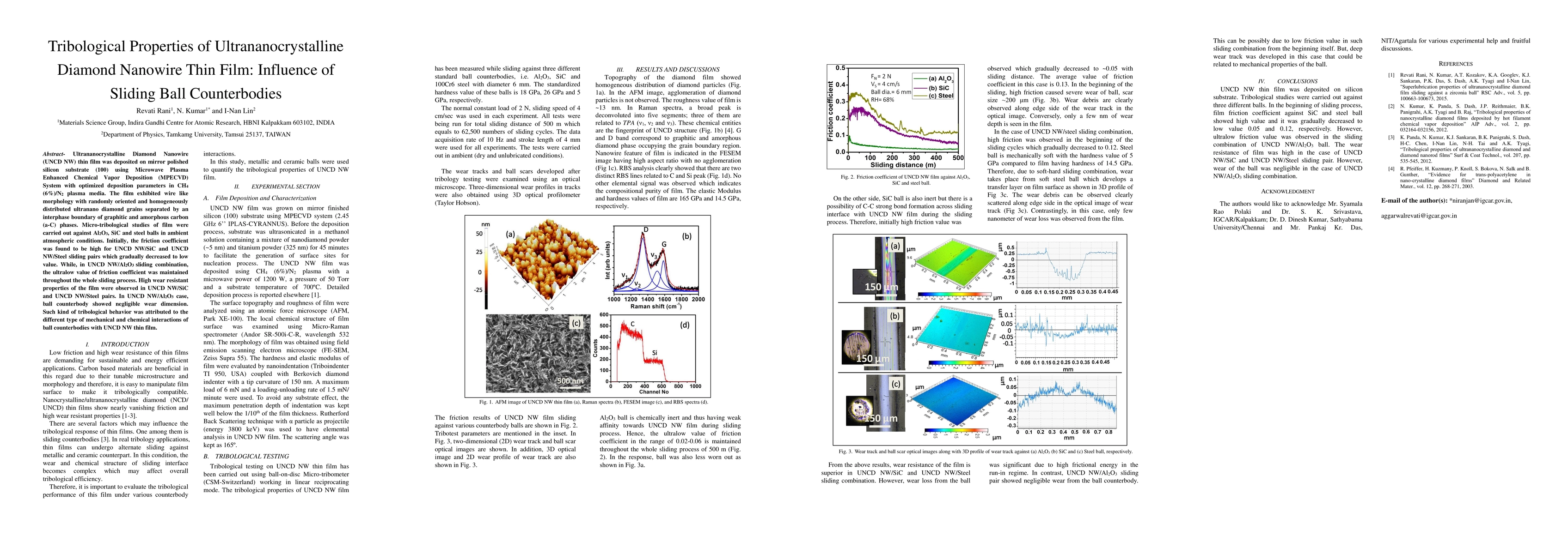 This study investigates the tribological properties of ultrananocrystalline diamond nanowire thin film deposited via MPECVD, finding that it exhibits ultralow friction when sliding against Al2O3 balls, while showing high initial friction but eventual low friction against SiC and steel balls, along with significant wear resistance.