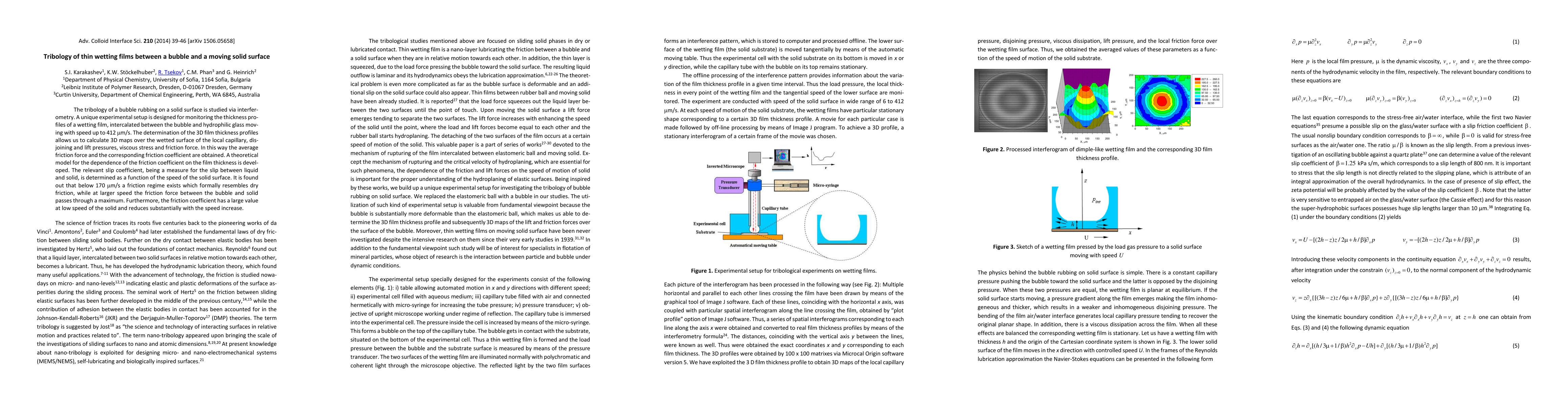 The tribology of a bubble rubbing on a solid surface is studied via interferometry. A unique experimental setup is designed for monitoring the thickness profiles of a wetting film, intercalated between the bubble and hydrophilic glass moving with speed up to 412 um/s. The determination of the 3D film thickness profiles allows us to calculate 3D maps over the wetted surface of the local capillary, disjoining and lift pressures, viscous stress and friction force. In this way the average friction force and the corresponding friction coefficient are obtained. A theoretical model for the dependence of the friction coefficient on the film thickness is developed. The relevant slip coefficient, being a measure for the slip between liquid and solid, is determined as a function of the speed of the solid surface. It is found out that below 170 um/s a friction regime exists which formally resembles dry friction, while at larger speed the friction force between the bubble and solid passes through a maximum. Furthermore, the friction coefficient has a large value at low speed of the solid and reduces substantially with the speed increase.